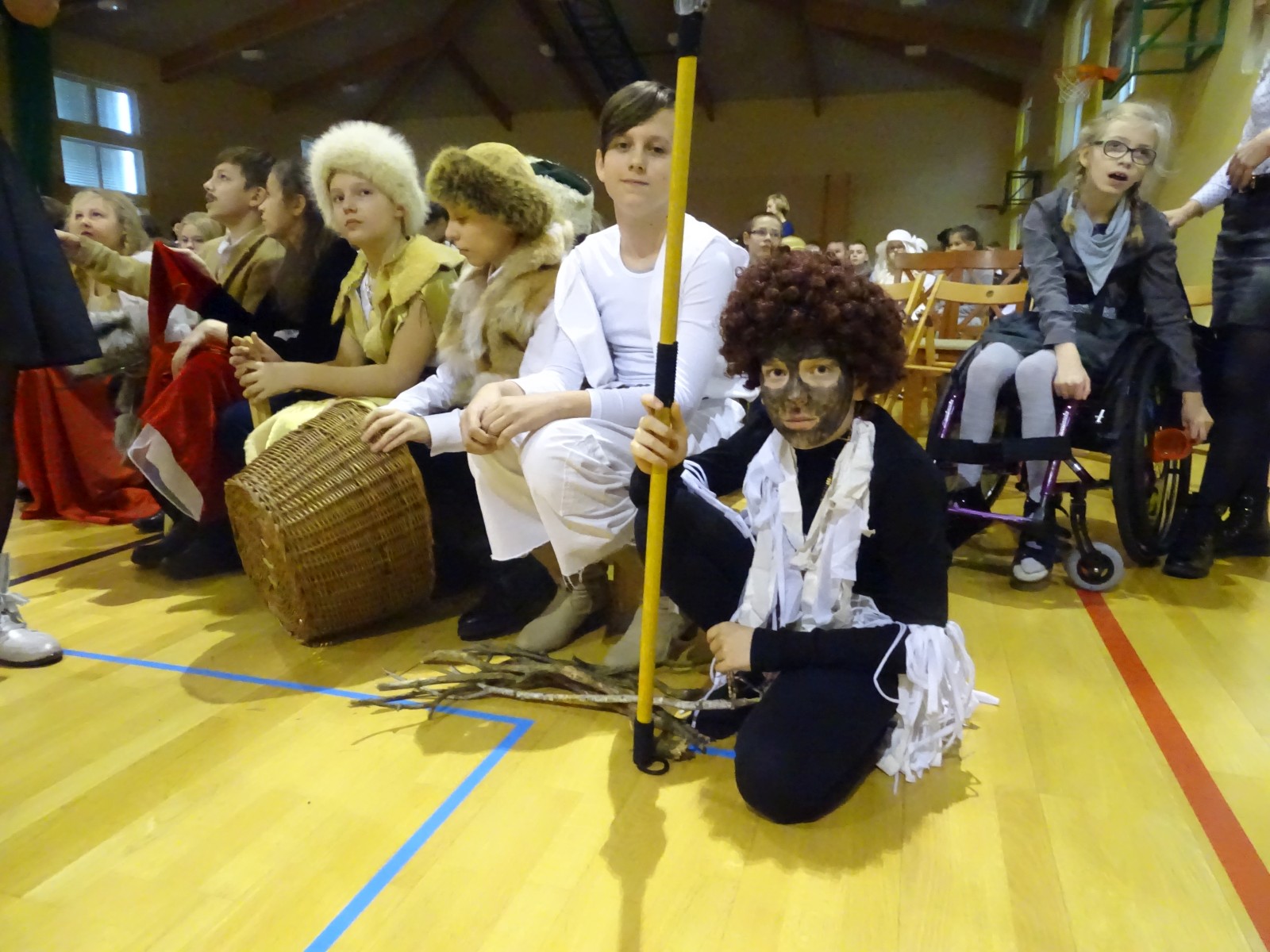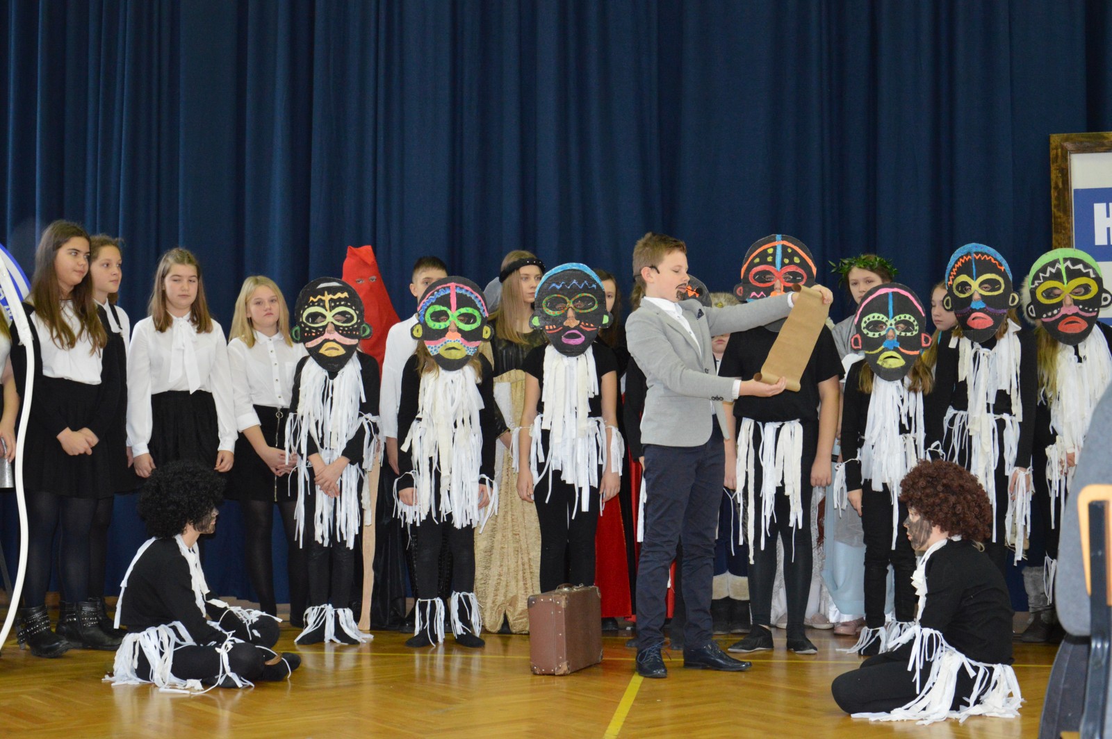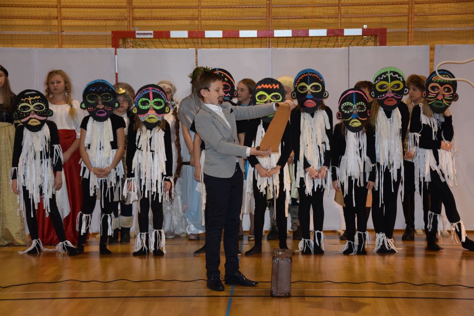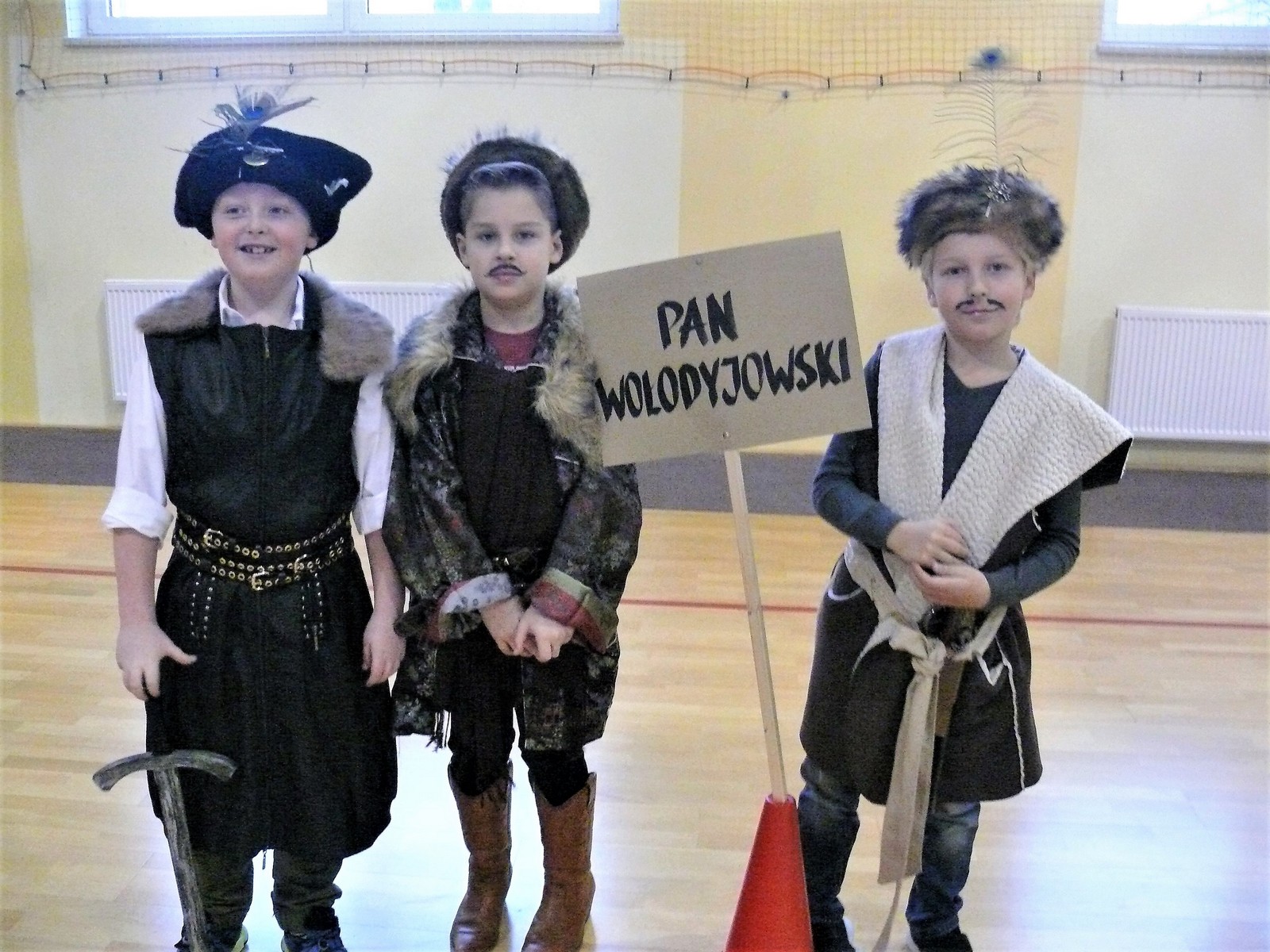 Młodzi aktorzy w zabawny sposób przybliżyli twórczość Henryka Sienkiewicza. Na spotkanie przybyli bohaterowie z „Potopu”, „Ogniem i mieczem”, „ Krzyżaków”, „W pustyni i w puszczy” i innych utworów. Przedstawienie wzbudzało zaciekawienie, humor a także element grozy. Przykładem była scena, kiedy kat miał ściąć głowę Zbyszka z Bogdańca, ale Danusia wstawiła się za nim wypowiadając słowa: „Mój ci on jest”. Zaskoczeniem dla publiczności było pojawienie się współczesnego listonosza, który przybiegł z listem od samego Sienkiewicza. Na spotkanie przybył w końcu on sam i odczytał „Dekalog” zaczynający się od słów: „ Jam jest Henryk Sienkiewicz, Wielka Wielkość Twoja, którym Cię wywiódł na pole sławy wszechświatowej”. Weseli Murzyni zatańczyli wg afrykańskich rytmów. Przedstawienie teatralne wzbogacały efekty plastyczne oraz zachwycający śpiew uczniów. Amelia Sobczyk i Bartosz Dziamara wzruszyli wszystkich, kiedy wykonali piosenkę „Dumka na dwa serca”. Na koniec przedstawienia swobodny rap i słowa piosenki podkreśliły, że Henryk Sienkiewicz jest Patronem znanym i lubianym.