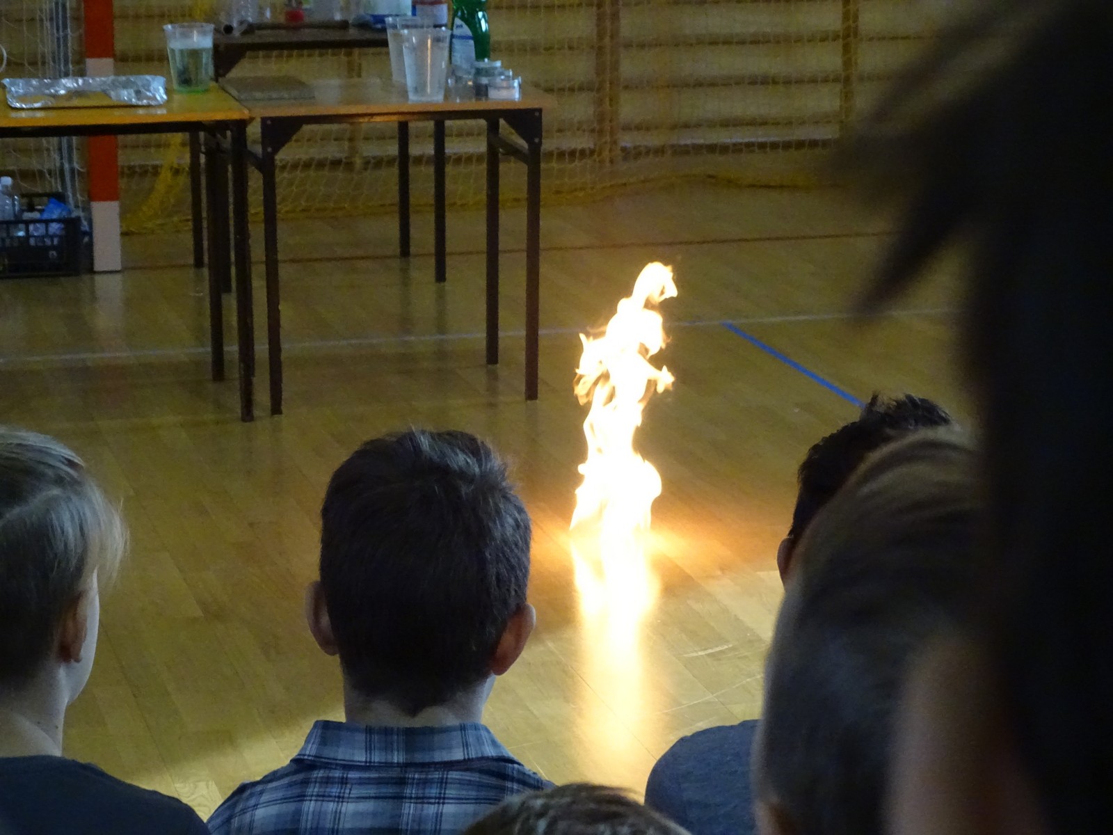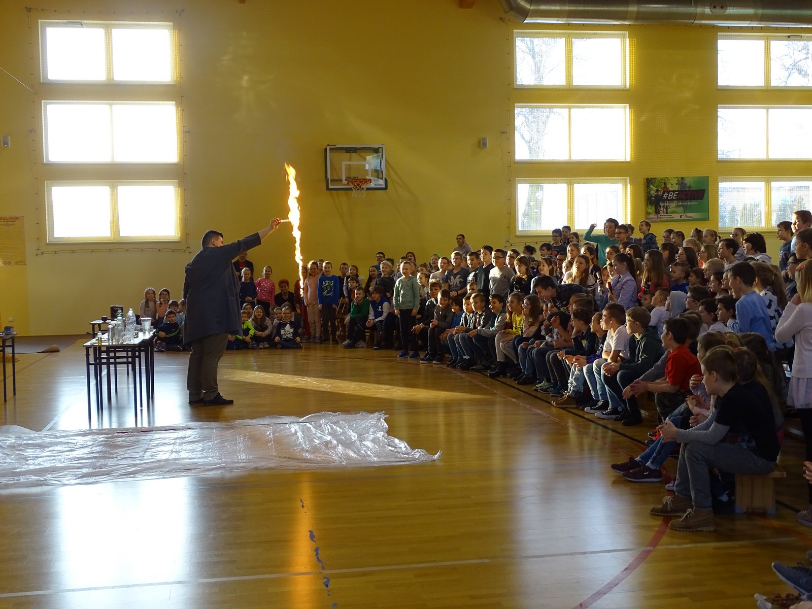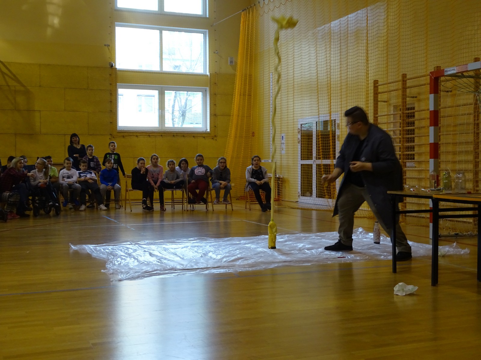 Pan Piotr na początku przybliżył uczniom podstawowe wiadomości z chemii. Później przystąpił do pokazu niesamowitych doświadczeń. Widownia była zaskoczona tym, co zobaczyła. Młody chemik zaprezentował uczniom nieskomplikowane, a zarazem ciekawe badania, które wszystkim bardzo się spodobały i zostały nagrodzony głośnymi owacjami.