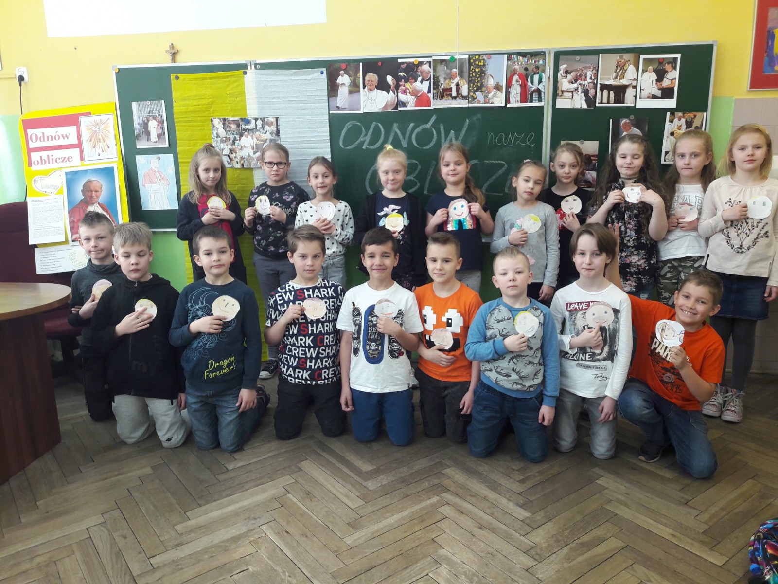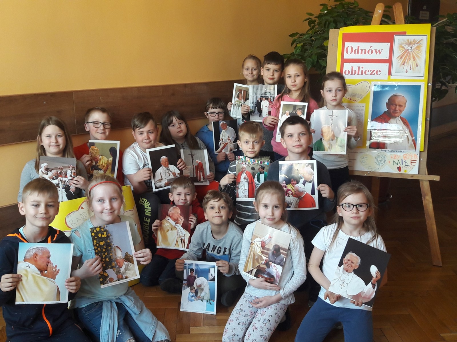 Z okazji 14 rocznicy odejścia do domu Ojca, naszego kochanego papieża – św. Jana Pawła II. , dzieci z klas 2 w czasie szkolnej katechezy - dziękowały i modliły się, w myśl hasła „ODNÓW OBLICZE” . To Miłość sprawia, że mamy łagodne spojrzenie, serdeczne i miłosierne. Jak zawsze i dzisiaj, potrzeba nam się starać, kształtować tak własny charakter, aby być życzliwym i otwartym na potrzeby drugiego człowieka. Dzieci z wielkim zaciekawieniem obejrzały fragment filmu, nagrany podczas spotkania papieża Jana Pawła II z dziećmi. Wykonane pamiątkowe zdjęcia niech przypominają nam, że życie na tej ziemi przemija, jak wspomniał to w Wadowicach Papież, cytując napis zamieszczony pod zegarem – „czas ucieka, wieczność czeka”. Warto zadbać, aby to co niezniszczalne w nas, trwało i ubogacało ludzkie życie.