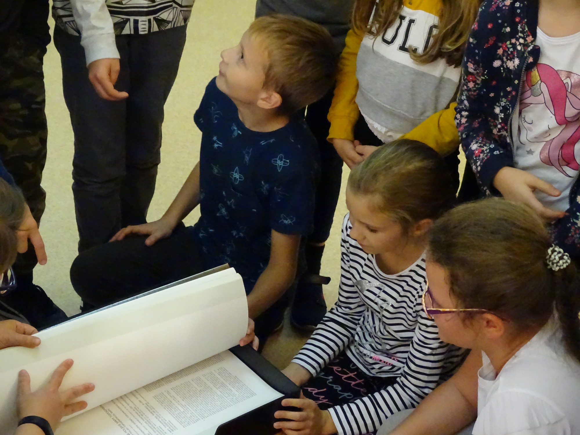 Spotkanie rozpoczęło się od pokazu oryginalnych eksponatów tej biblioteki, najmniejszych i największych egzemplarzy książek. Uczniowie z dużym zainteresowaniem oglądali wyjątkowe okazy.