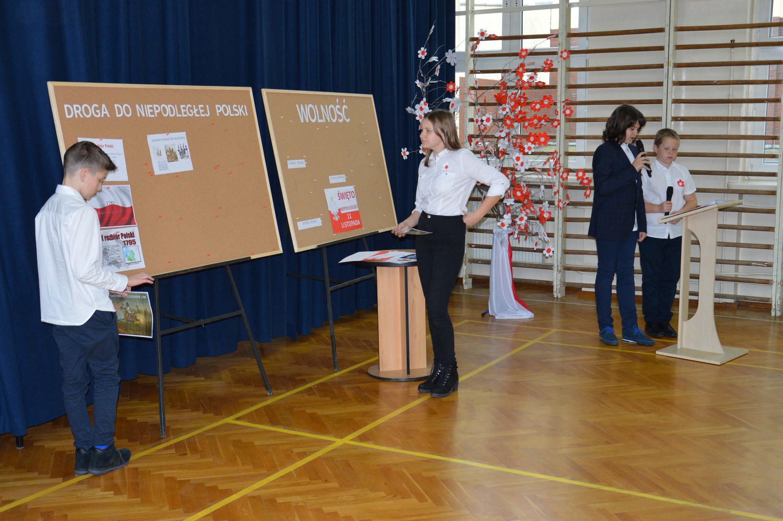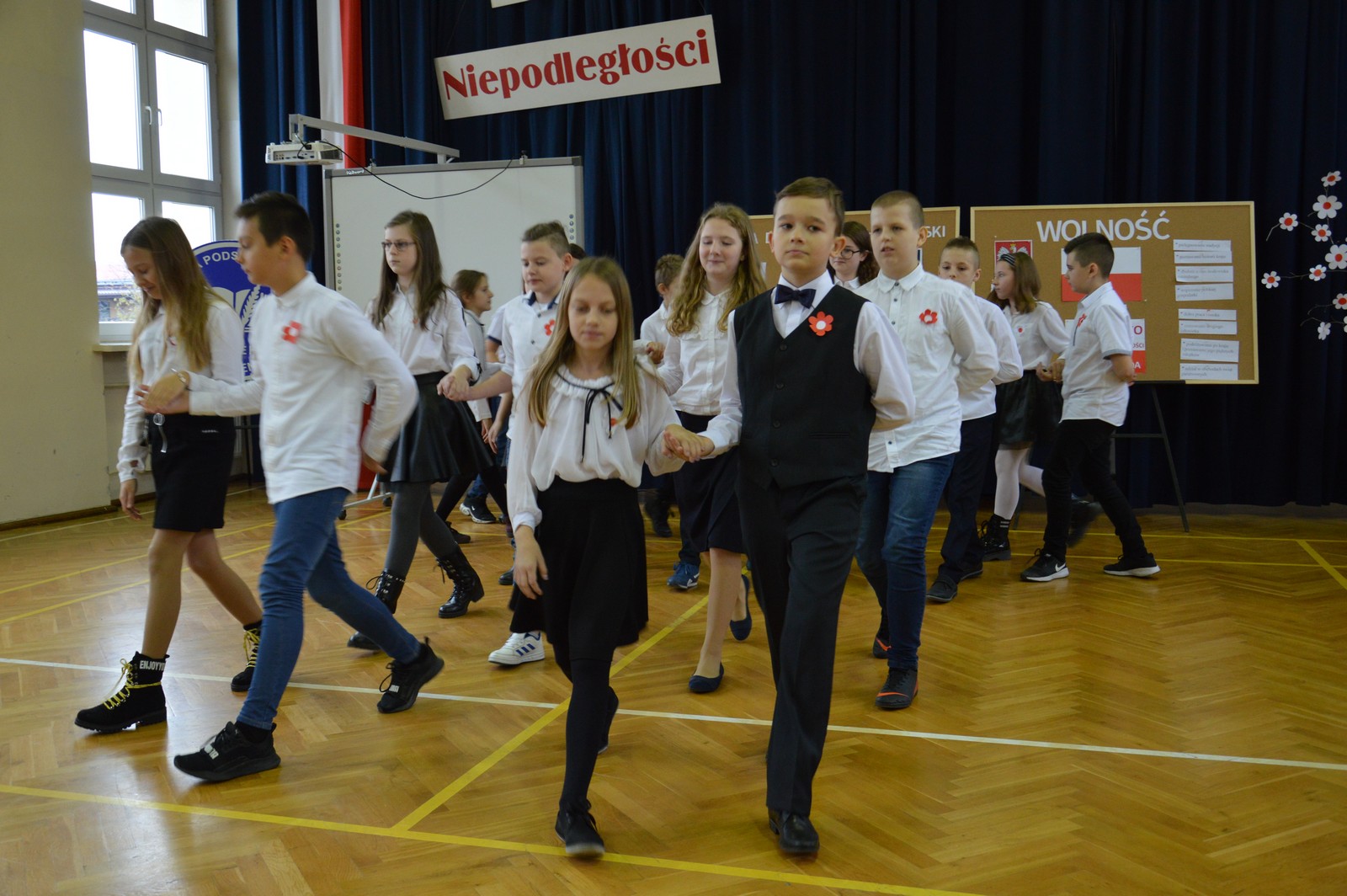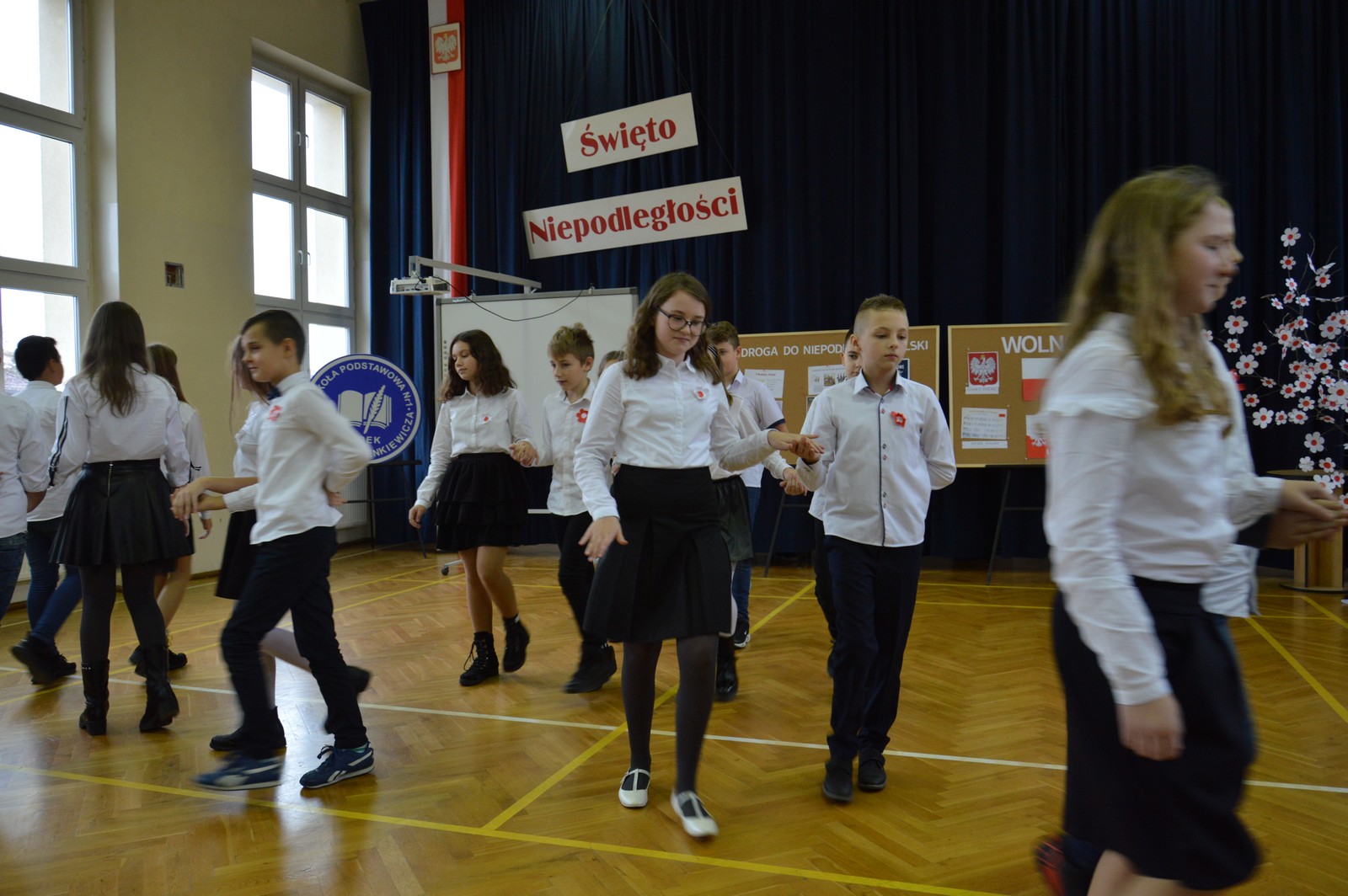 i przygotowane na tę okoliczność „drzewko niepodległościowe” ozdobiły nasz korytarz szkolny. Następnie obejrzano film pt.: „Co to jest niepodległość”, przy wtórze piosenki o tym samym tytule. Kolejna pieśń „Jest takie miejsce” wzbudziła silne emocje i potwierdziła, jak bardzo związani jesteśmy z naszą ojczyzną. Polski taniec narodowy – polonez, w wykonaniu klasy V d, zakończył naszą uroczystość. Dziękujemy wszystkim uczniom za chwile pełne wzruszeń.