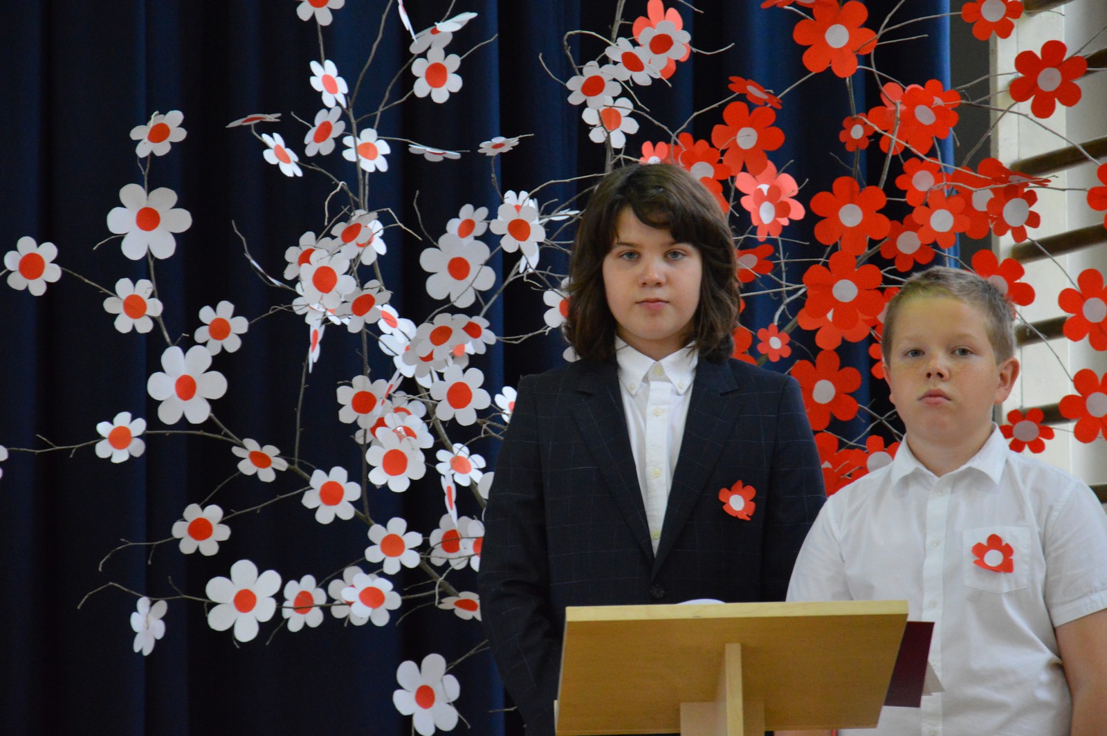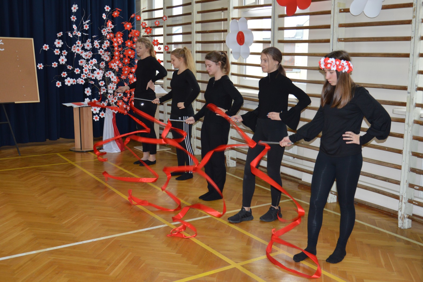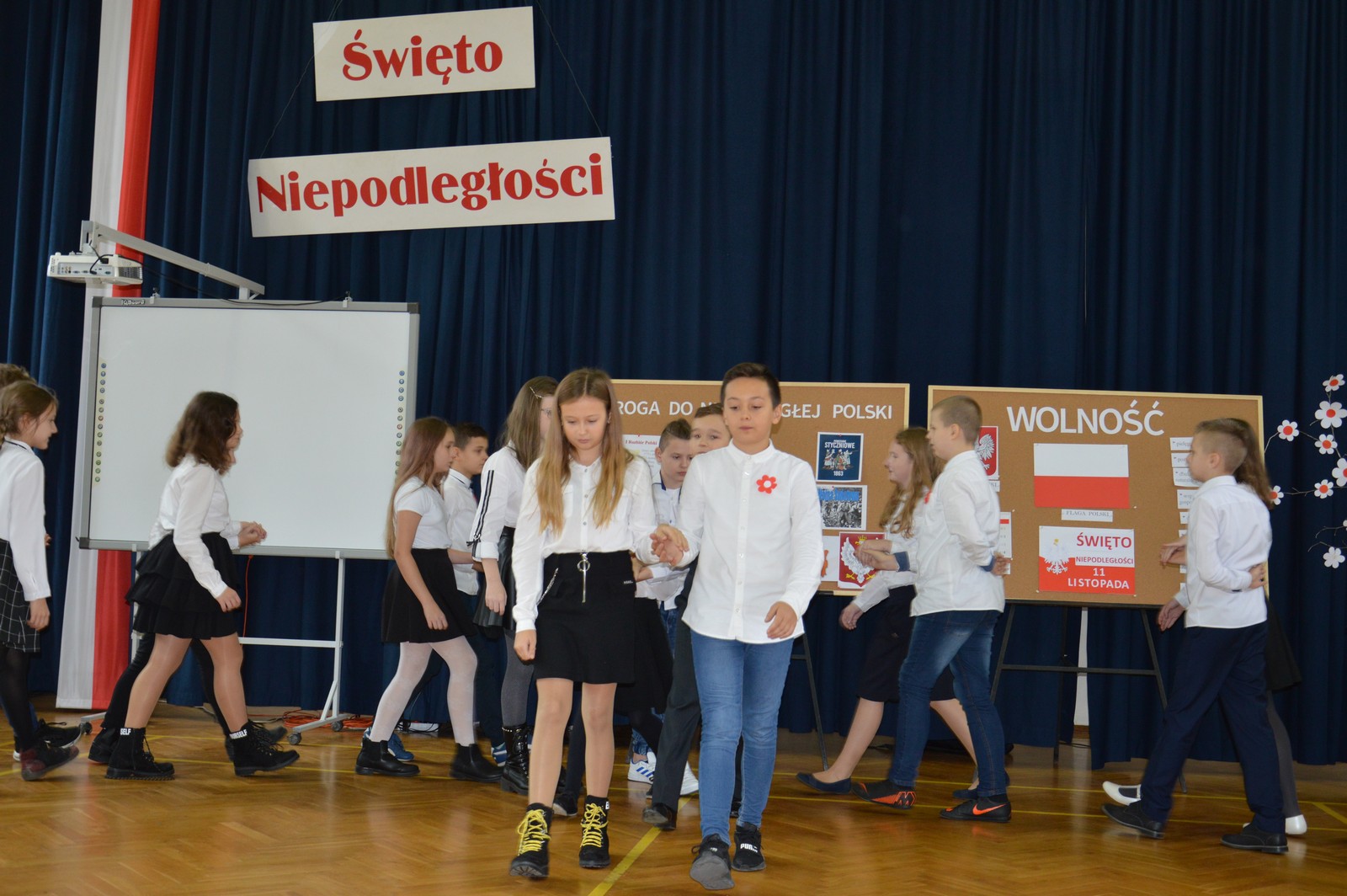 i przygotowane na tę okoliczność „drzewko niepodległościowe” ozdobiły nasz korytarz szkolny. Następnie obejrzano film pt.: „Co to jest niepodległość”, przy wtórze piosenki o tym samym tytule. Kolejna pieśń „Jest takie miejsce” wzbudziła silne emocje i potwierdziła, jak bardzo związani jesteśmy z naszą ojczyzną. Polski taniec narodowy – polonez, w wykonaniu klasy V d, zakończył naszą uroczystość. Dziękujemy wszystkim uczniom za chwile pełne wzruszeń.