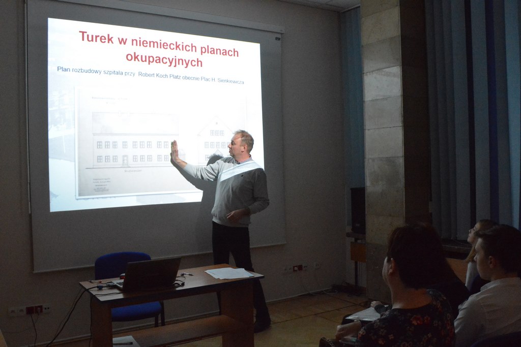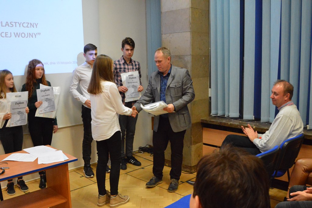 We wtorkowe popołudnie 19.11.2019r. w siedzibie Miejskiej Biblioteki Publicznej w Turku odbyło się rozstrzygnięcie dwóch konkursów połączone ze spotkaniem dla uczestników Programu 50+. Pierwszy z nich dotyczył wykonania prezentacji multimedialnej pod hasłem: „Turek w czasie II wojny światowej”, a drugi konkurs - wykonania pracy plastycznej w formie plakatu pod hasłem „Nigdy więcej wojny”. Komisja Konkursowa w składzie: Bartosz Stachowiak - Dyrektor Muzeum Miasta Turku, Małgorzata Pawłowska – pracownik Czytelni Książek, Czasopism i Zbiorów Regionalnych oraz Marcin Michalak – pracownik Pracowni Komputerowej i Wypożyczalni Zbiorów Multimedialnych, postanowiło przyznać 3 nagrody. Pierwsze miejsce zajęła prezentacja multimedialna Mikołaja Kacprzaka i Szymona Kurzawy, uczniów kl. VIIId Szkoły Podstawowej nr 1 w Turku, drugie miejsce zajęły uczennice kl. VI d Szkoły Podstawowej nr 1 – Lena Gradzik i Gabriela Macudzińska. Opiekunem uczniów naszej szkoły była pani Irena Dominiak. Natomiast miejsce trzecie przypadło Martynie Kazikowskiej, uczennicy kl. VI d Szkoły Podstawowej nr 5 w Turku.