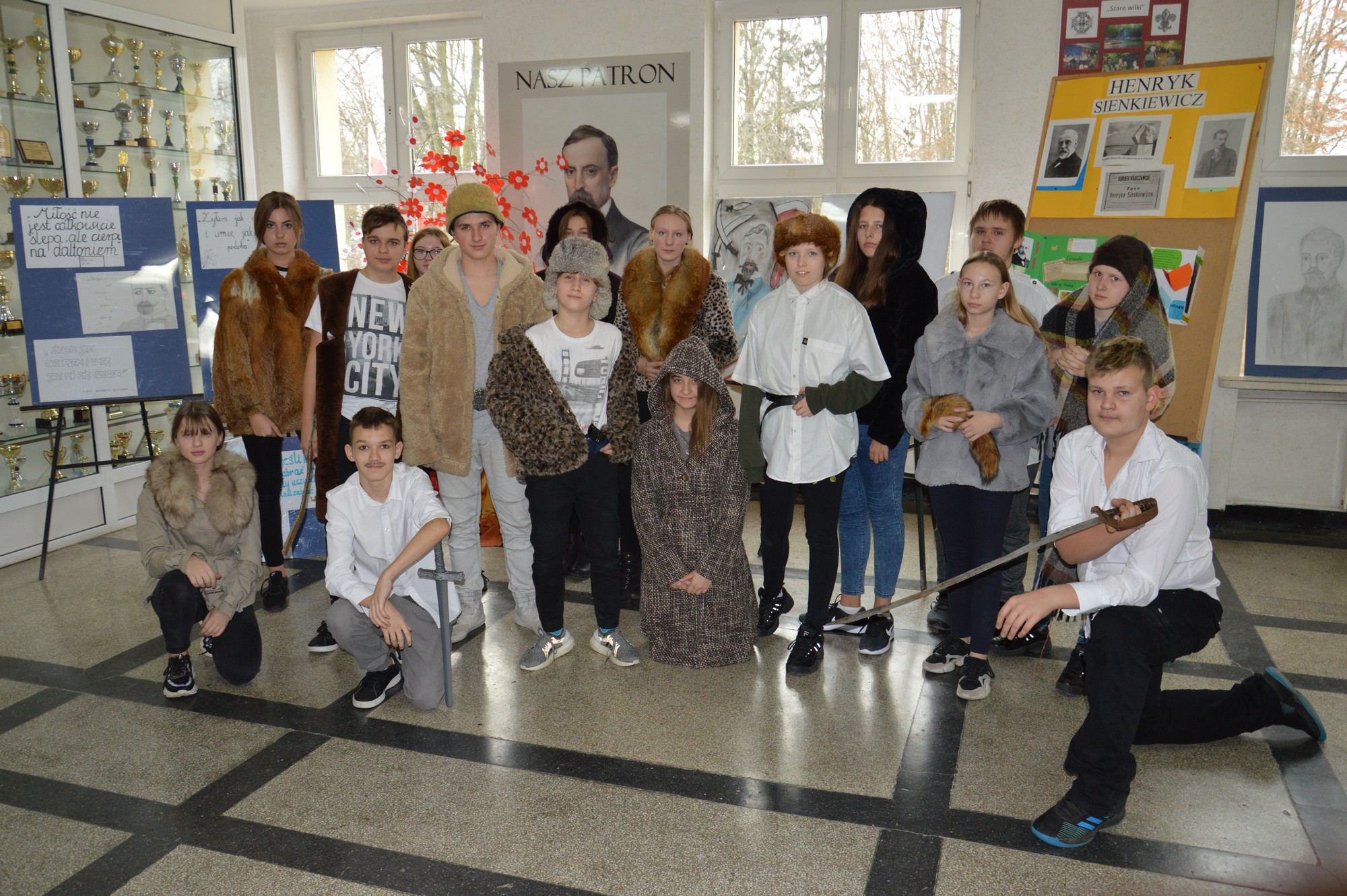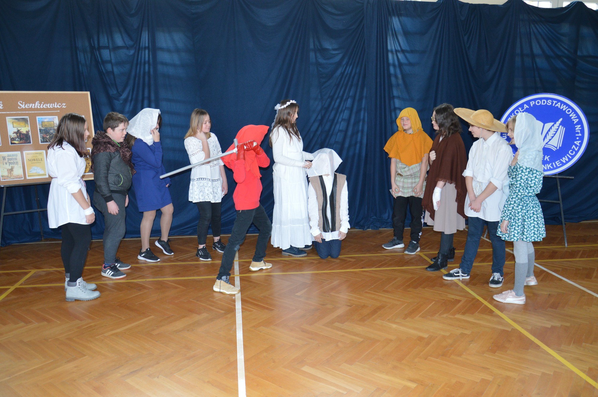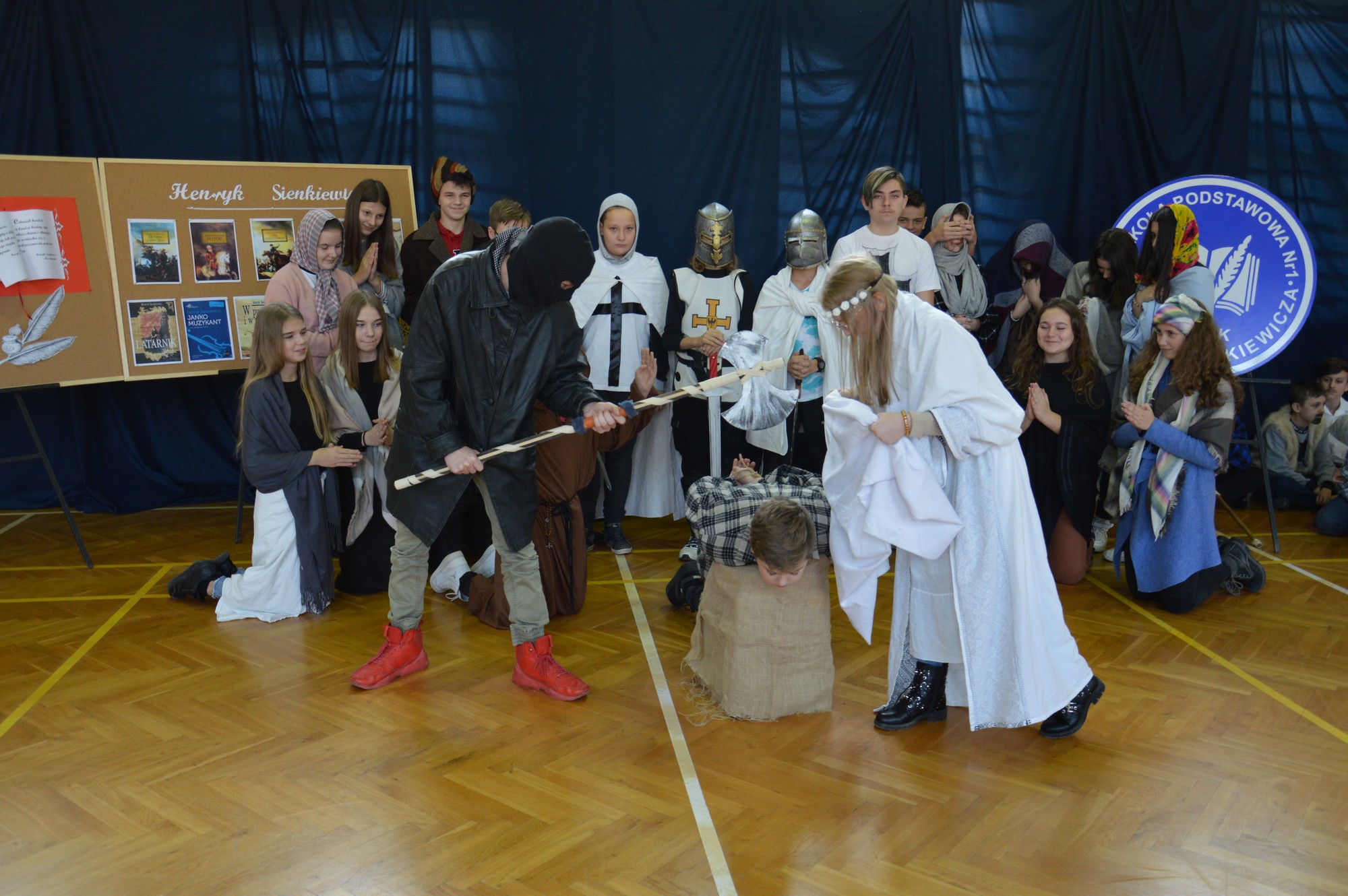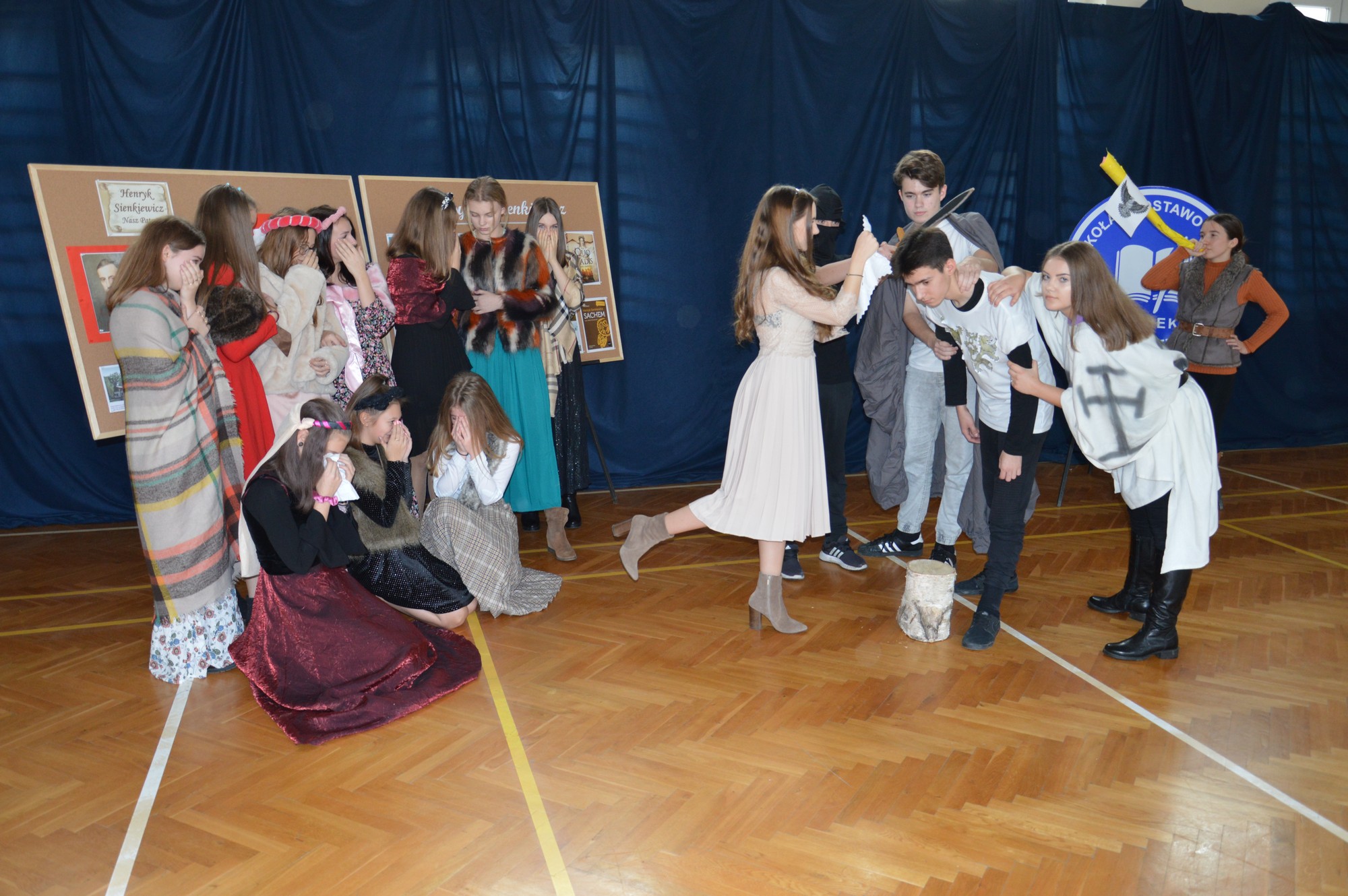 Uczniowie wcielili się w role bohaterów literackich z utworów Patrona i przenieśliśmy się w świat, jaki na łamach swych dzieł literackich stworzył Sienkiewicz. Pozostali uczniowie na sali odgadywali tytuł utworu, z którego pochodziła przedstawiana scena. Ogrom braw świadczył o tym, że wszyscy znakomicie się zaprezentowali. Wyłonienie zwycięzców nie było łatwym zadaniem.