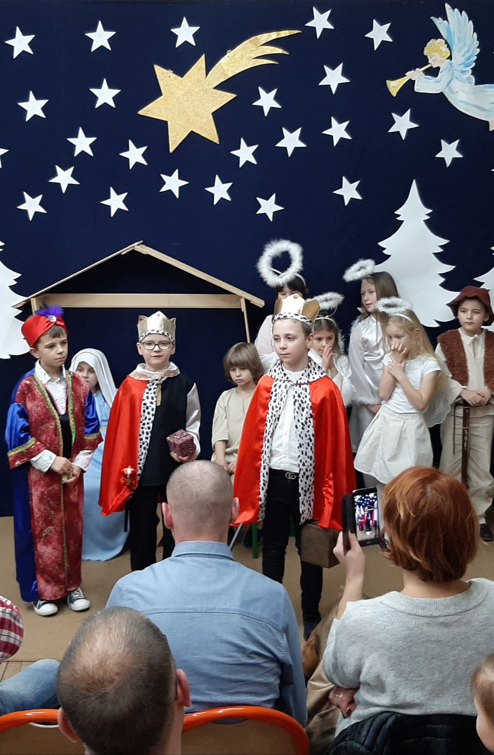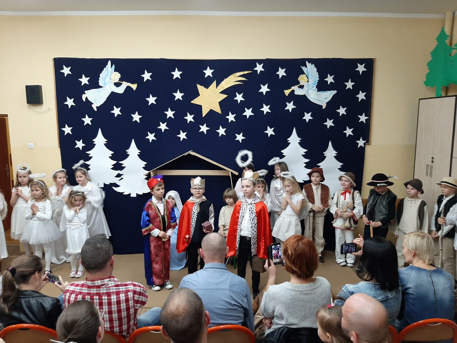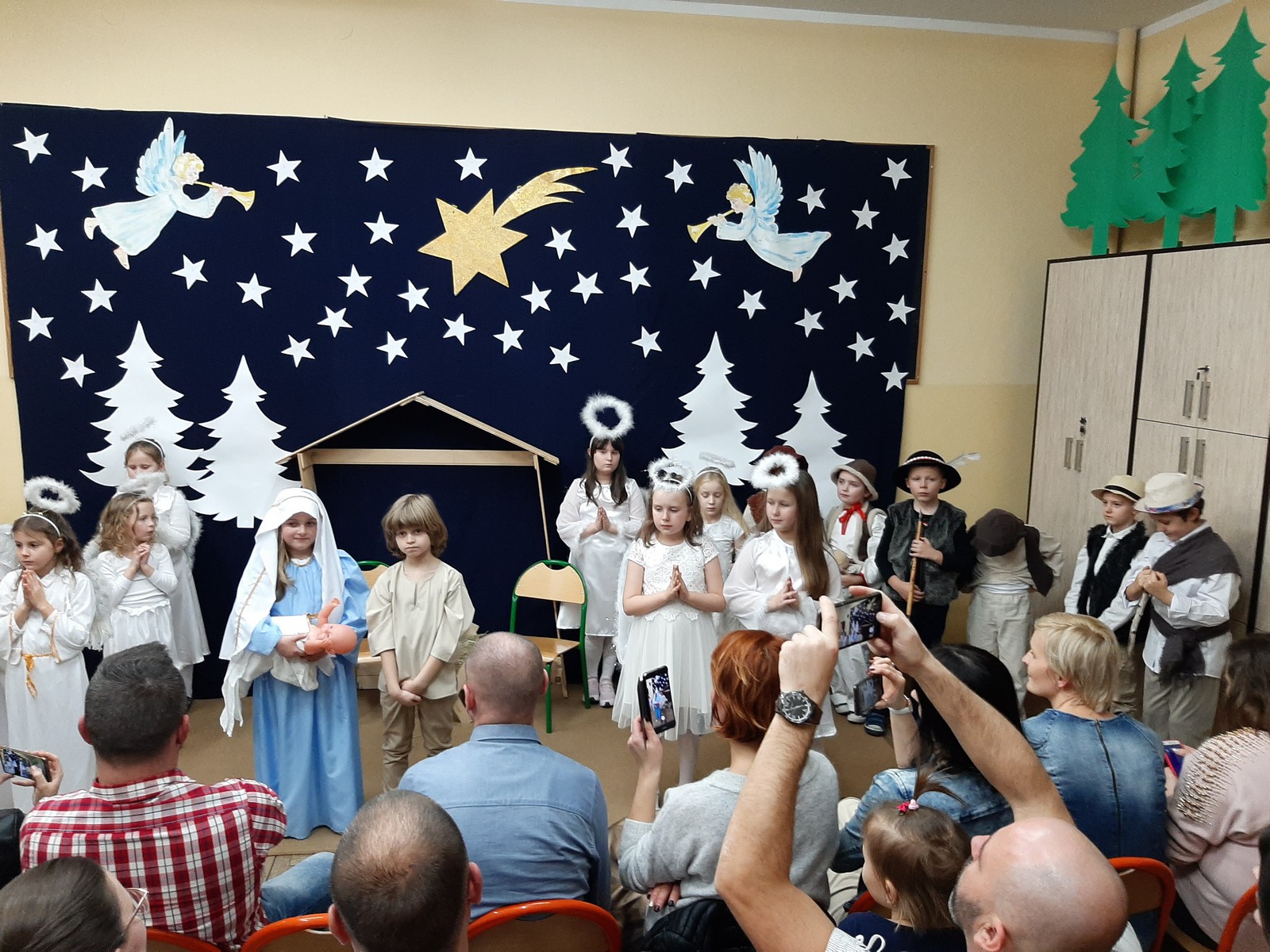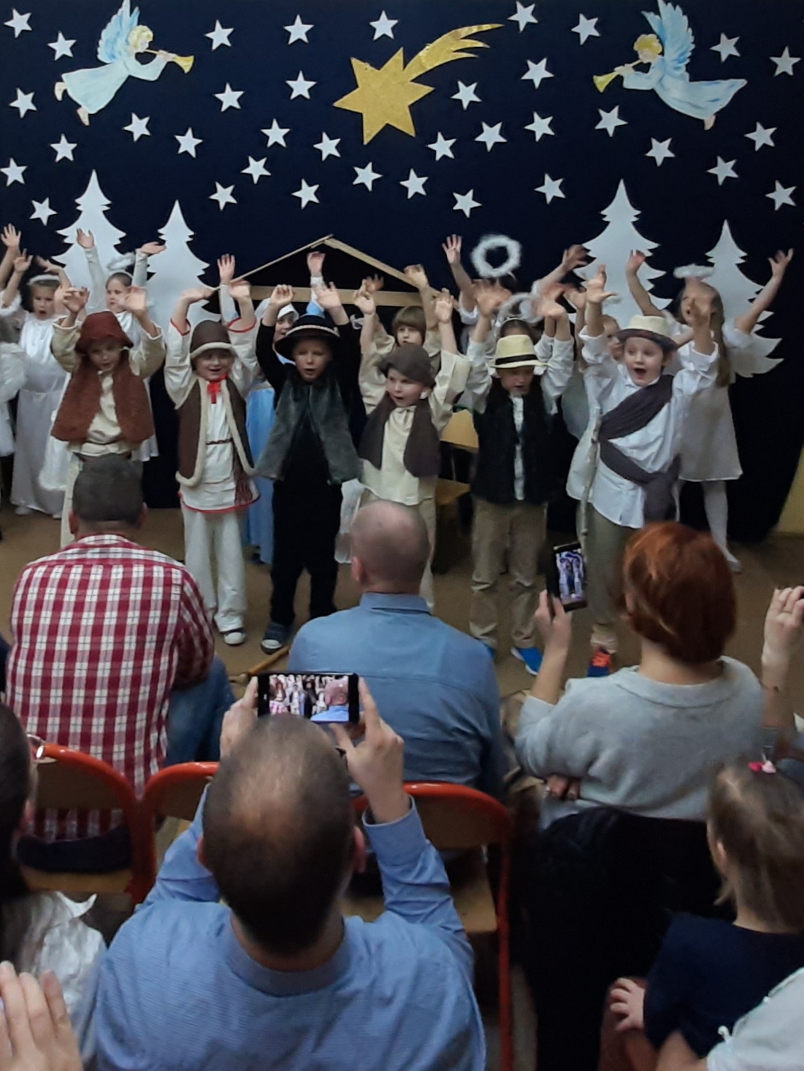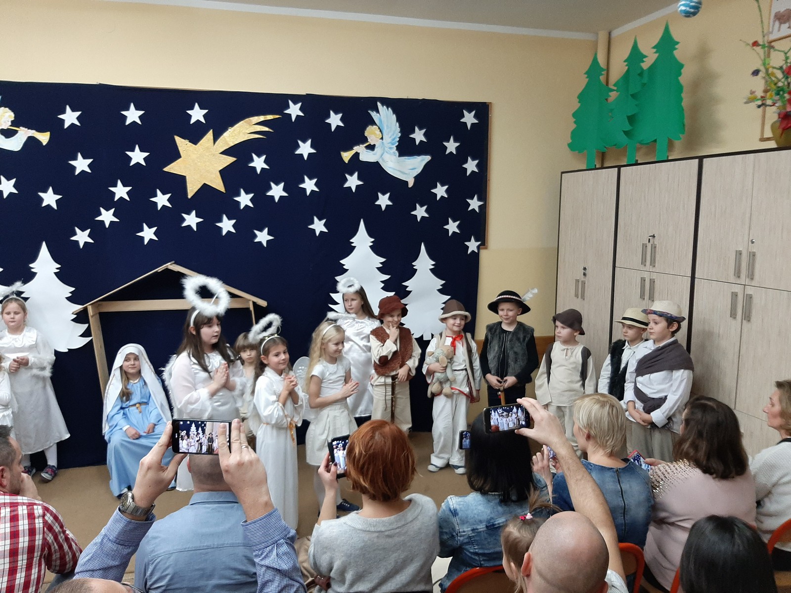 17 grudnia, w godzinach popołudniowych, uczniowie z klasy 1c z wychowawczynią p. Agnieszką Perlińską, wystawili bożonarodzeniowe jasełka PRZY BOŻYM ŻŁÓBKU SIĘ ZEBRALI. Na przedstawienie zaprosili najważniejszych widzów- rodziców. Uczniowie wcielili się w tradycyjne postaci z betlejemskiej szopki. Byli Józef i Maria, zatroskani i zmęczeni poszukiwaniem miejsca do narodzin Jezuska. Sceny wystawione w jasełkach obrazowały moment przybycia Trzech Króli, biednych pasterzy i opiekę Dzieciątka przez anioły. Dzieci zaprezentowały się w recytacji, śpiewie, tańcu i grze na instrumentach. Wzruszeni rodzice nagrodzili małych artystów gromkimi brawami oraz drobnymi prezentami i poczęstunkiem. To był nasz pierwszy klasowy występ przed publicznością!