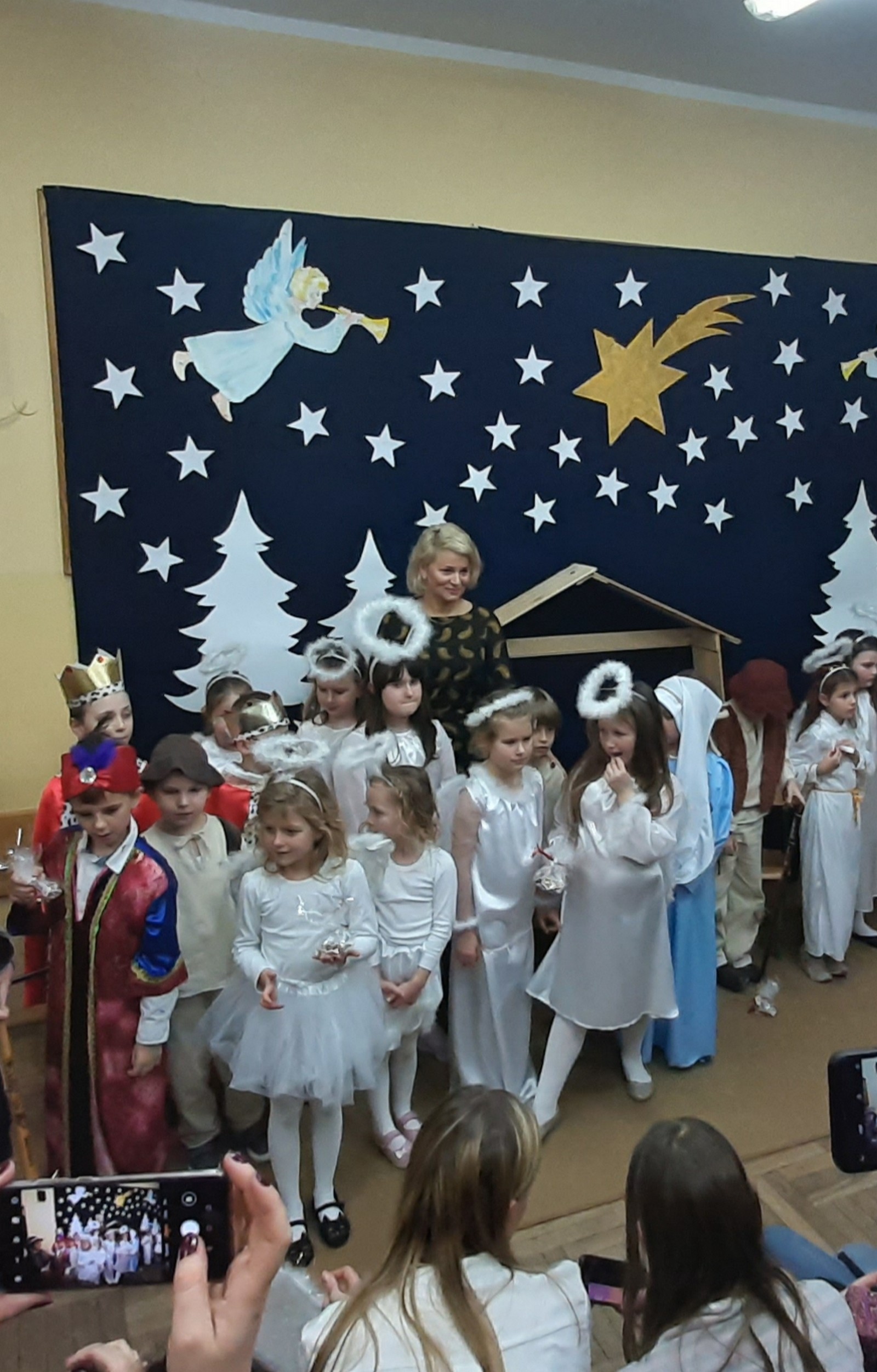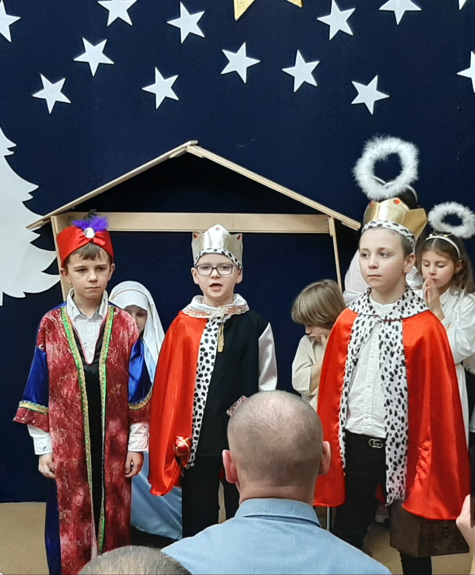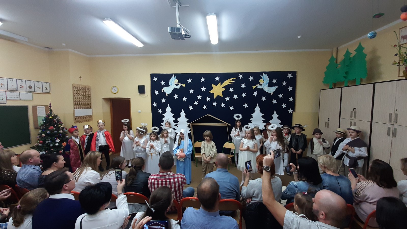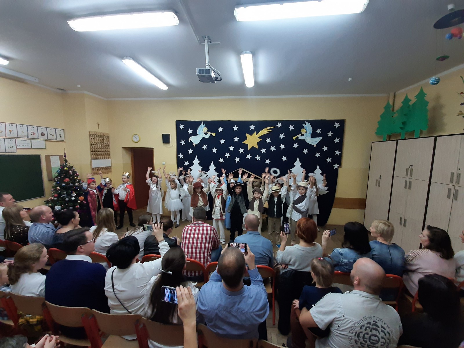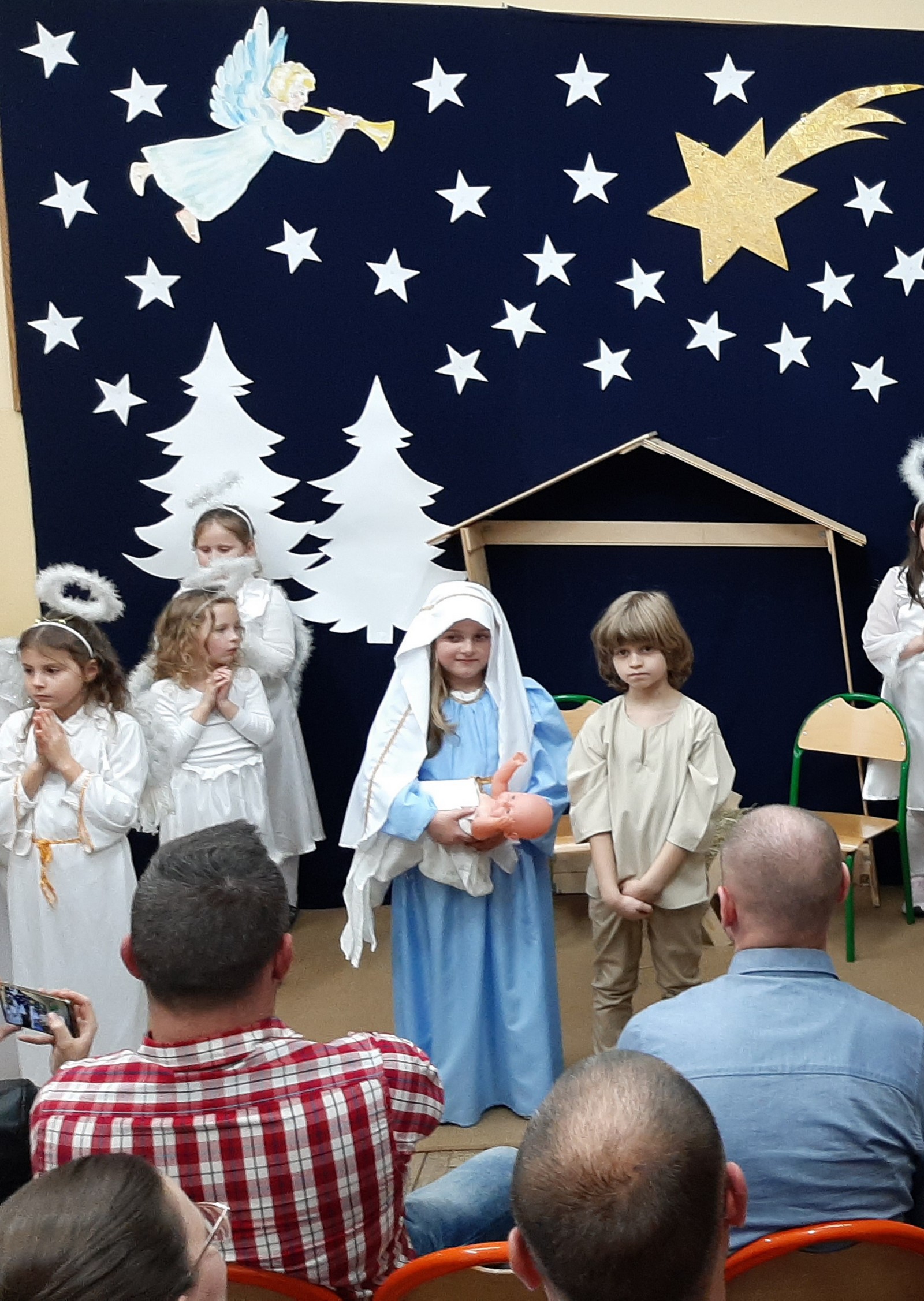 17 grudnia, w godzinach popołudniowych, uczniowie z klasy 1c z wychowawczynią p. Agnieszką Perlińską, wystawili bożonarodzeniowe jasełka PRZY BOŻYM ŻŁÓBKU SIĘ ZEBRALI. Na przedstawienie zaprosili najważniejszych widzów- rodziców. Uczniowie wcielili się w tradycyjne postaci z betlejemskiej szopki. Byli Józef i Maria, zatroskani i zmęczeni poszukiwaniem miejsca do narodzin Jezuska. Sceny wystawione w jasełkach obrazowały moment przybycia Trzech Króli, biednych pasterzy i opiekę Dzieciątka przez anioły. Dzieci zaprezentowały się w recytacji, śpiewie, tańcu i grze na instrumentach. Wzruszeni rodzice nagrodzili małych artystów gromkimi brawami oraz drobnymi prezentami i poczęstunkiem. To był nasz pierwszy klasowy występ przed publicznością!
