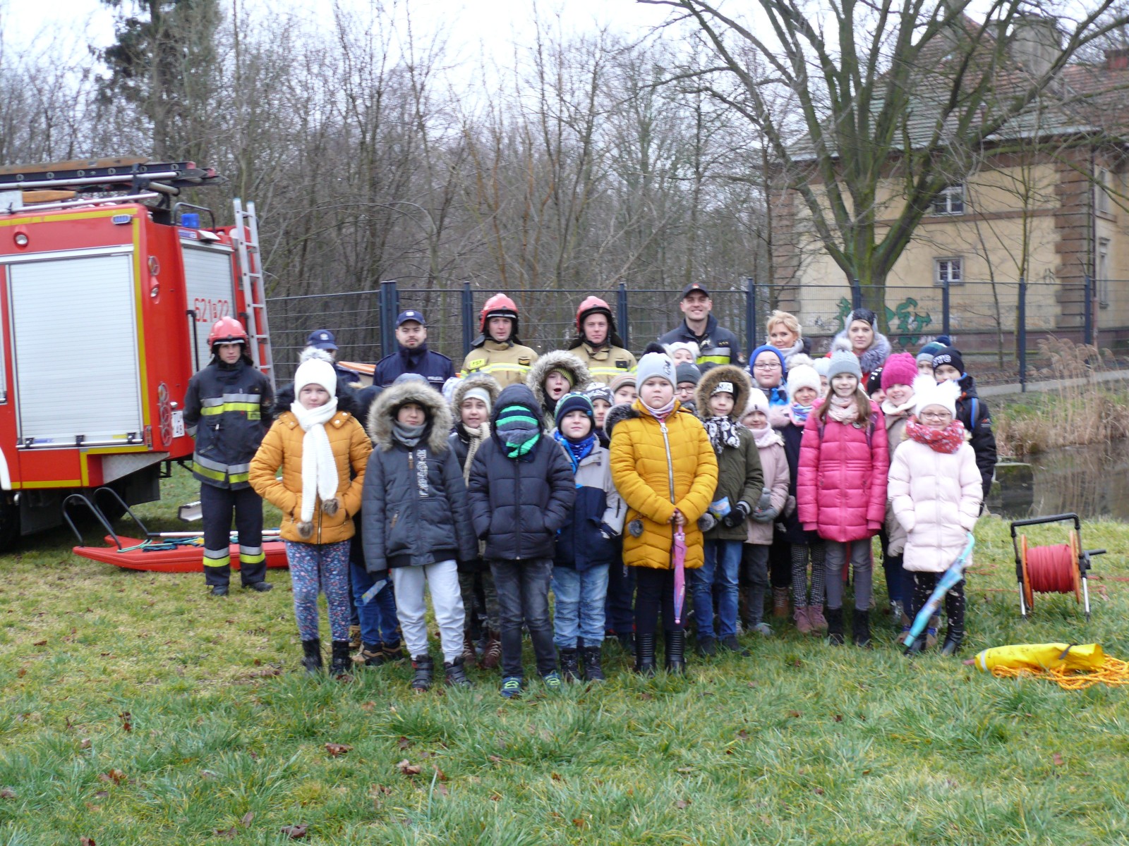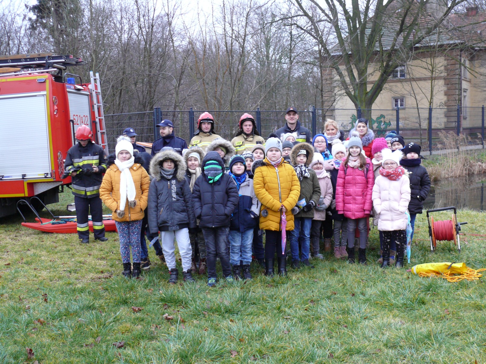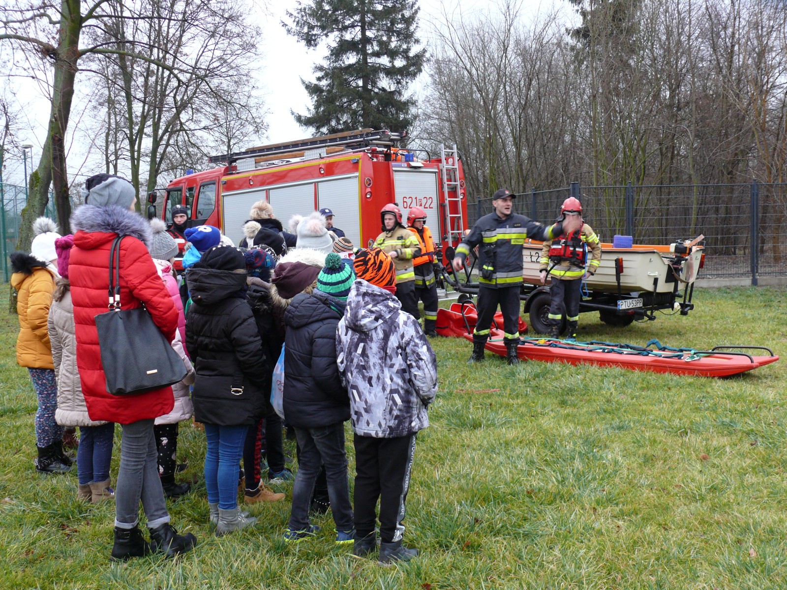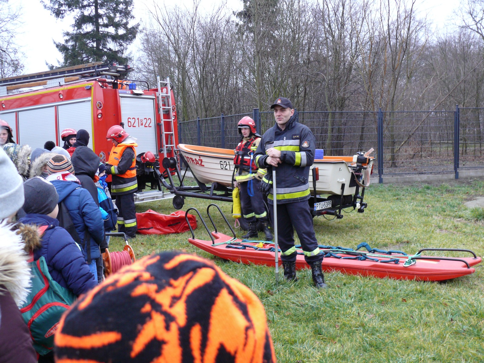 W ramach akcji „Bezpieczne ferie” Państwowej Straży Pożarnej przy ul. św. Floriana, uczniowie kl. 2c i 3a pod opieką p. A. Sujewicz, A. Szymczyk oraz M. Poturały, uczestniczyli w spotkaniu i pogadance, zorganizowanych w trosce o bezpieczeństwo najmłodszych i młodzieży. W siedzibie komendy dzieci spotkały się nie tylko z funkcjonariuszami Państwowej Straży Pożarnej, ale również Policji. Strażacy omówili niebezpieczeństwa związane z sezonem grzewczym oraz podkreślali korzyści płynące z zamontowania w domach czujek dymu oraz czadu, a także jak postępować, gdy sami zostajemy w domu. Następnie uczniowie mogli przyjrzeć się pokazowi akcji ratowniczej. Strażacy ostrzegali przed zabawami na zamarzniętych zbiornikach wodnych i zaprezentowali podejmowanie z wody osoby, pod którą załamał się lód. Było to bardzo edukacyjne spotkanie.
