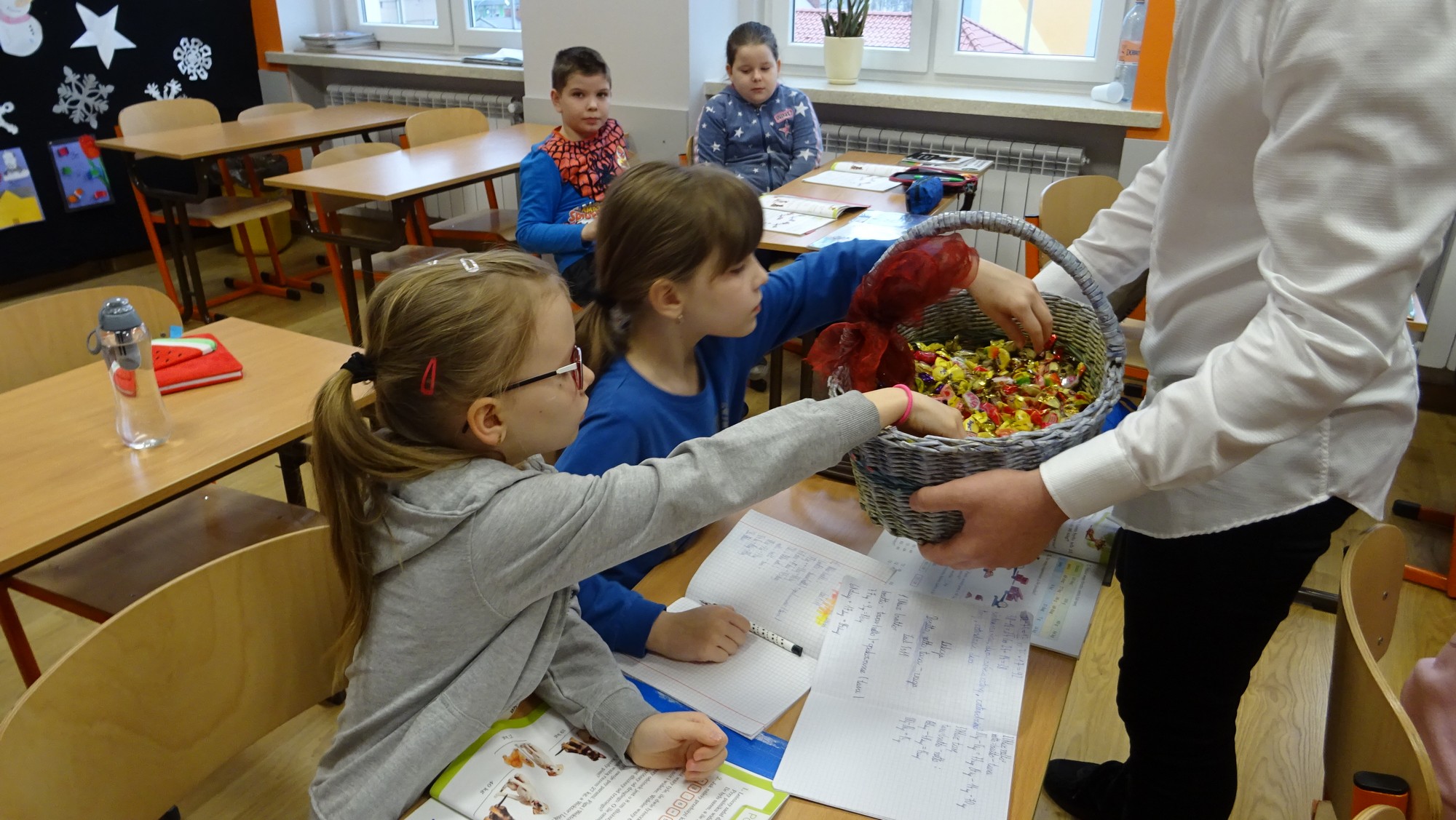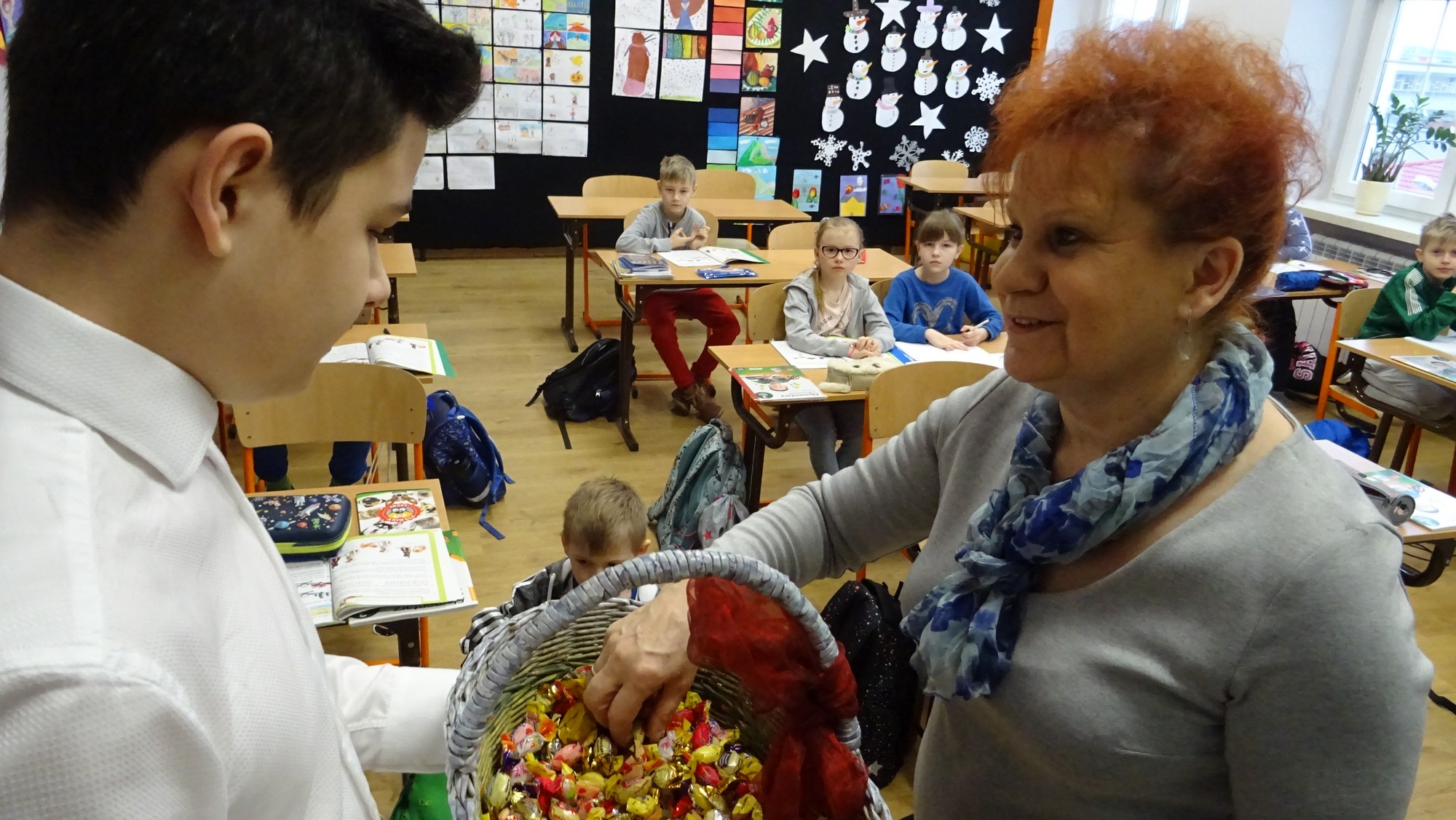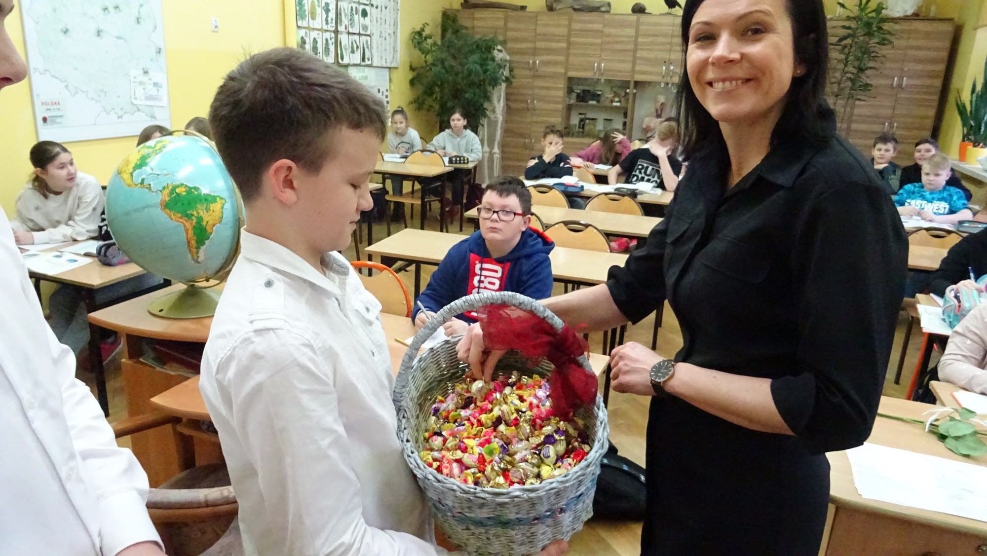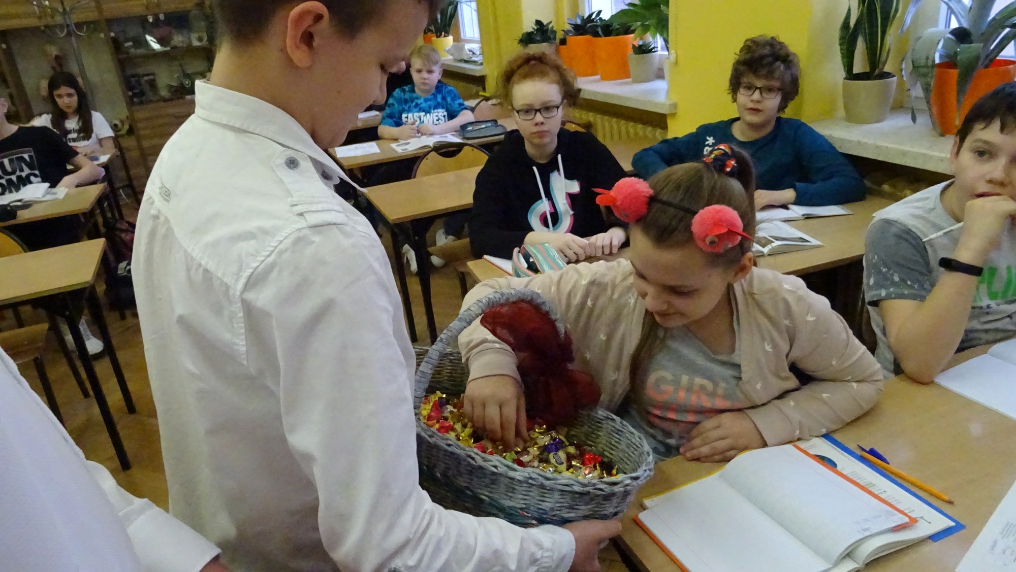 6 marca w budynku przy ulicy 3 Maja, obchodziliśmy Dzień Kobiet. Z tej okazji chłopcy- przedstawiciele Samorządu Uczniowskiego, w imieniu własnym i wszystkich kolegów, składali życzenia Paniom pracującym w szkole oraz młodszym i starszym Koleżankom. Oprócz tradycyjnych życzeń, każda z Pań i Dziewcząt została obdarowana cukierkiem.