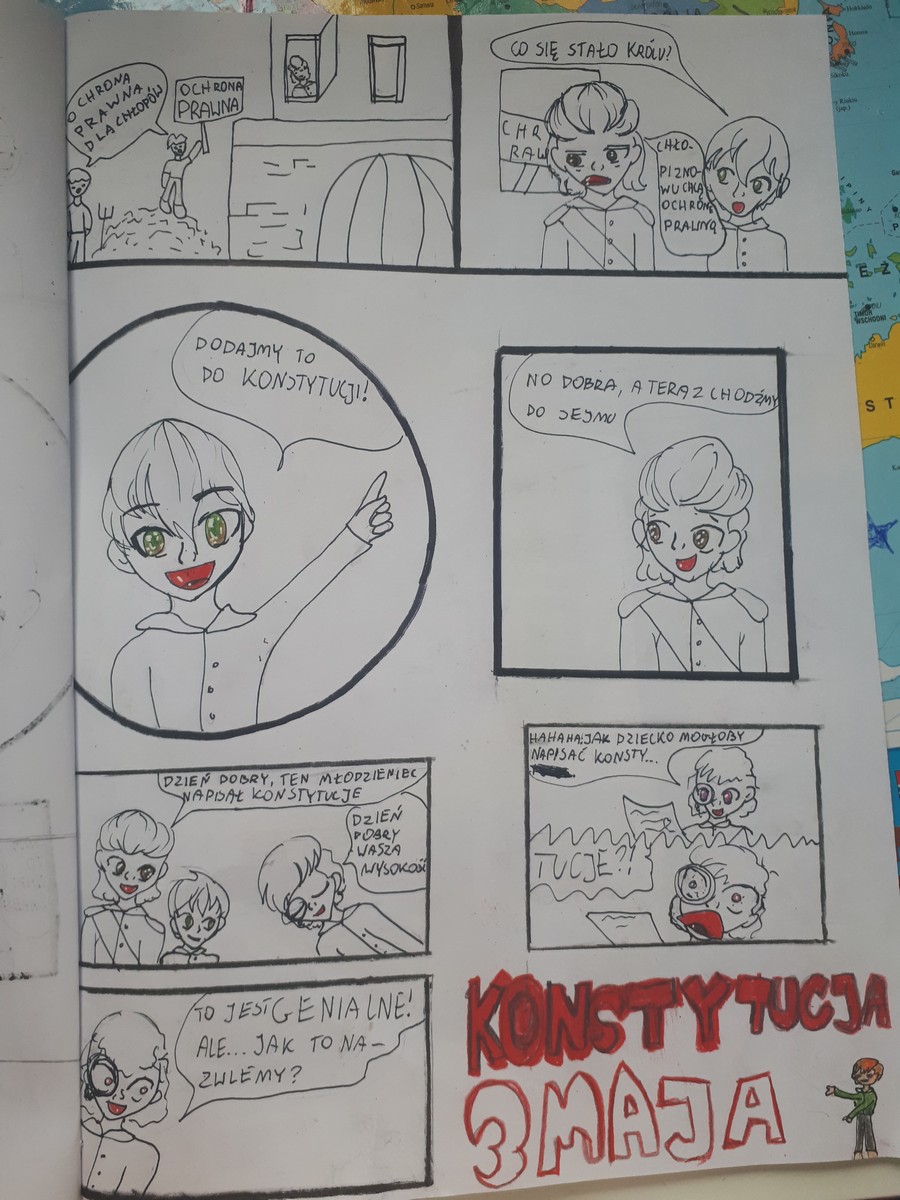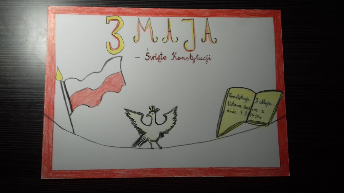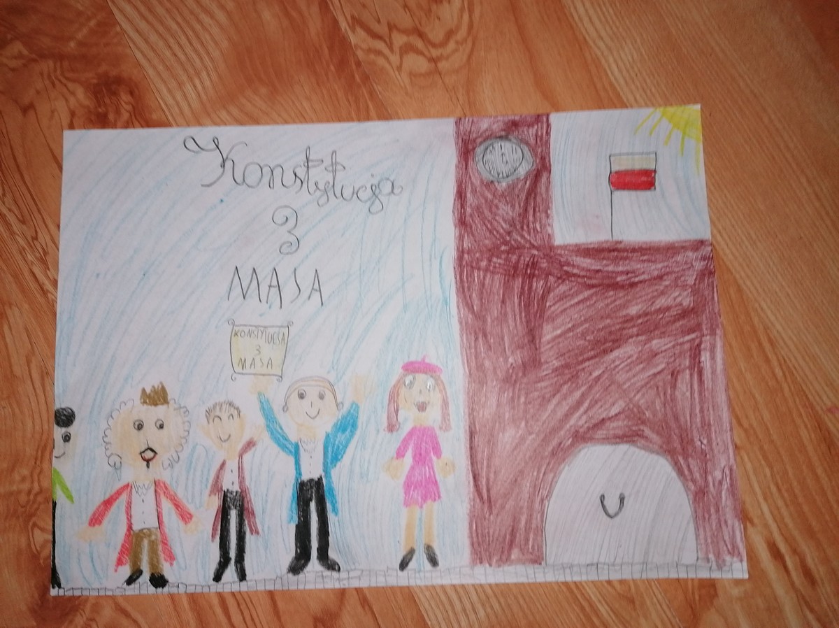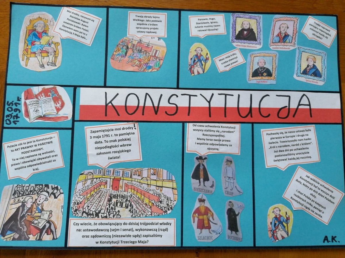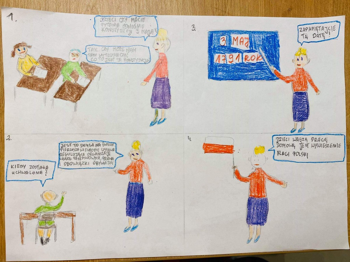 W tym roku uczniowie Szkoły Podstawowej nr 1 im. Henryka Sienkiewicza nie mogli obchodzić tego święta tak, jak to bywało w latach ubiegłych. Uroczyste apele, wystawy, wspólne śpiewanie pieśni patriotycznych nie były możliwe do zrealizowania. Ale to nie oznacza, że można było pominąć ten ważny w kalendarzu imprez szkolnych dzień. Uczniowie „Jedynki” z tej okazji przygotowali komiksy. Każdy zawierał ciekawostki na temat obchodzonego święta lub pomysły na świętowanie w dobie pandemii koronawirusa. Pomysłowość uczniów nie miała granic. Twórcy komiksów zaprezentowali m. in. pomysł zorganizowania wirtualnego koncertu, wirtualnego biegu z okazji Święta Konstytucji 3 Maja czy utworzenie zespołu muzycznego „Konstytucja”, którego członkowie to Konsty i Tucja. Młodsi uczniowie wzięli udział w wirtualnej lekcji historii na Zamku Królewskim w Warszawie, a następnie przystąpili do zilustrowania tego ważnego dla państwa polskiego wydarzenia, wyrażając uczucie radości i dumy, że są Polakami.