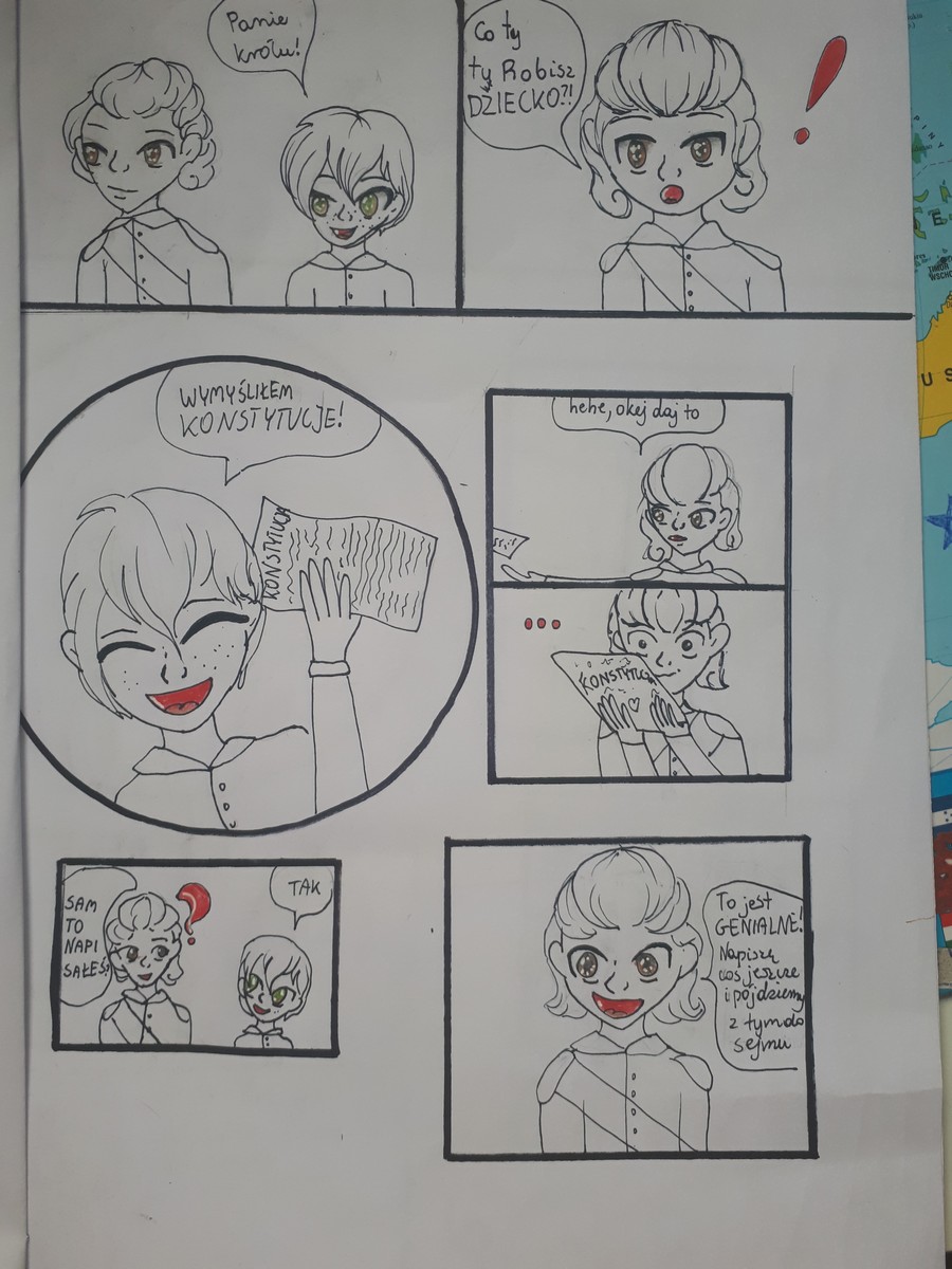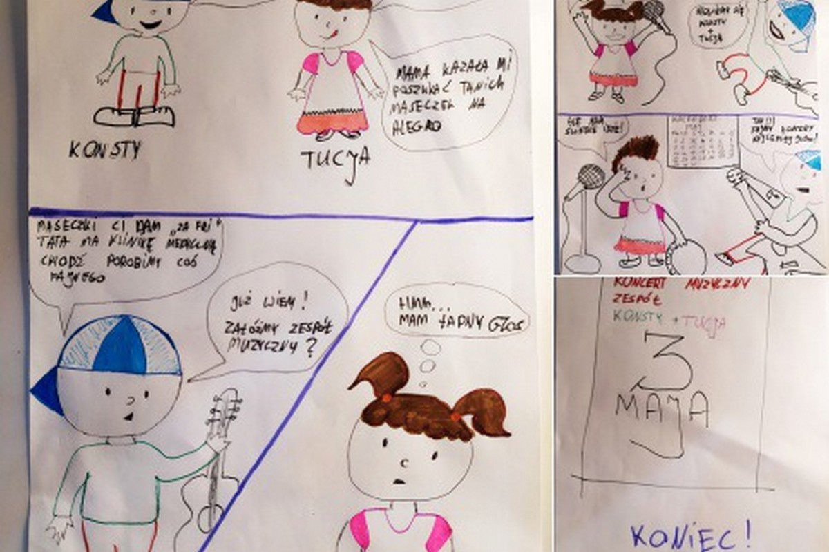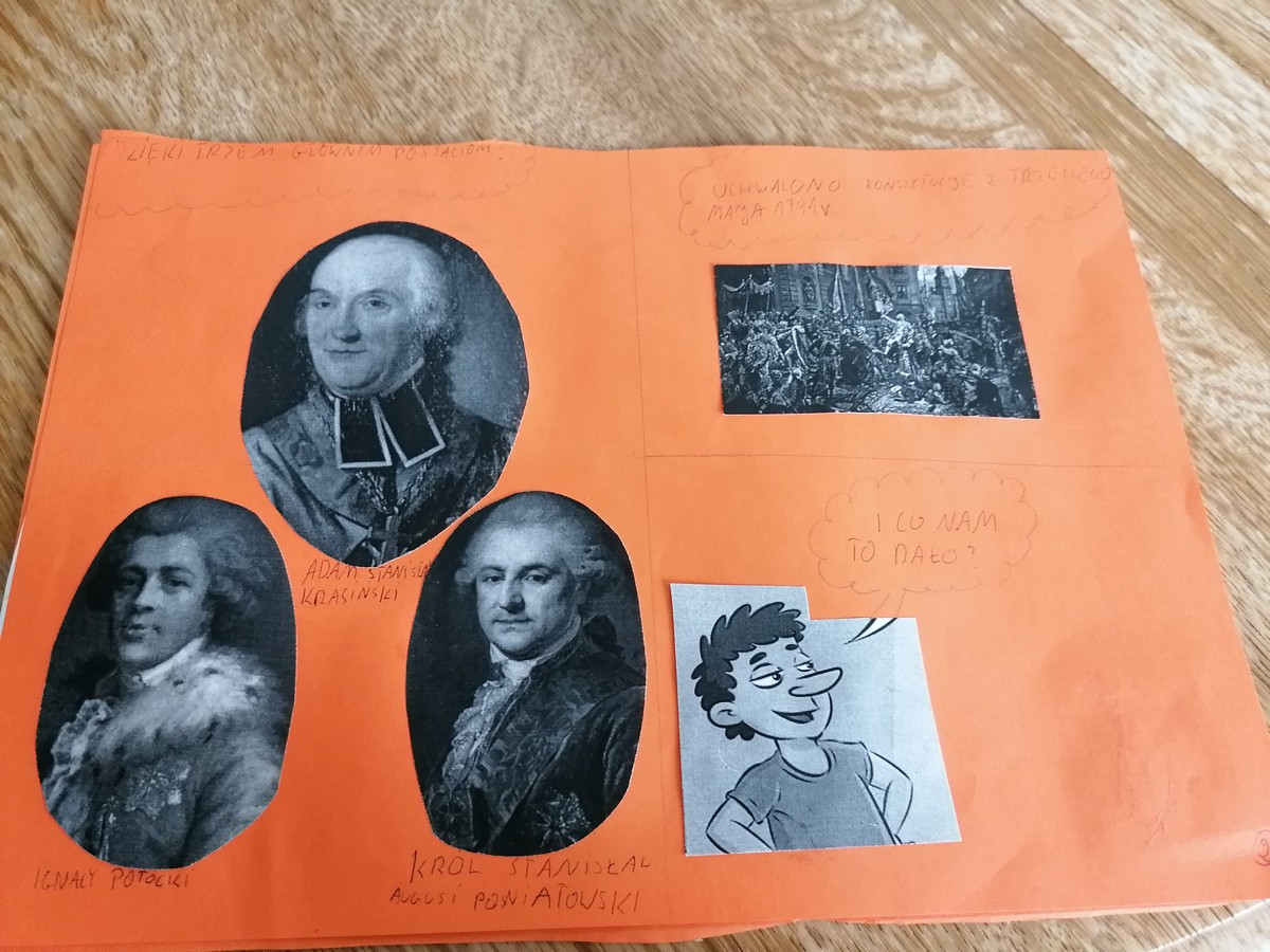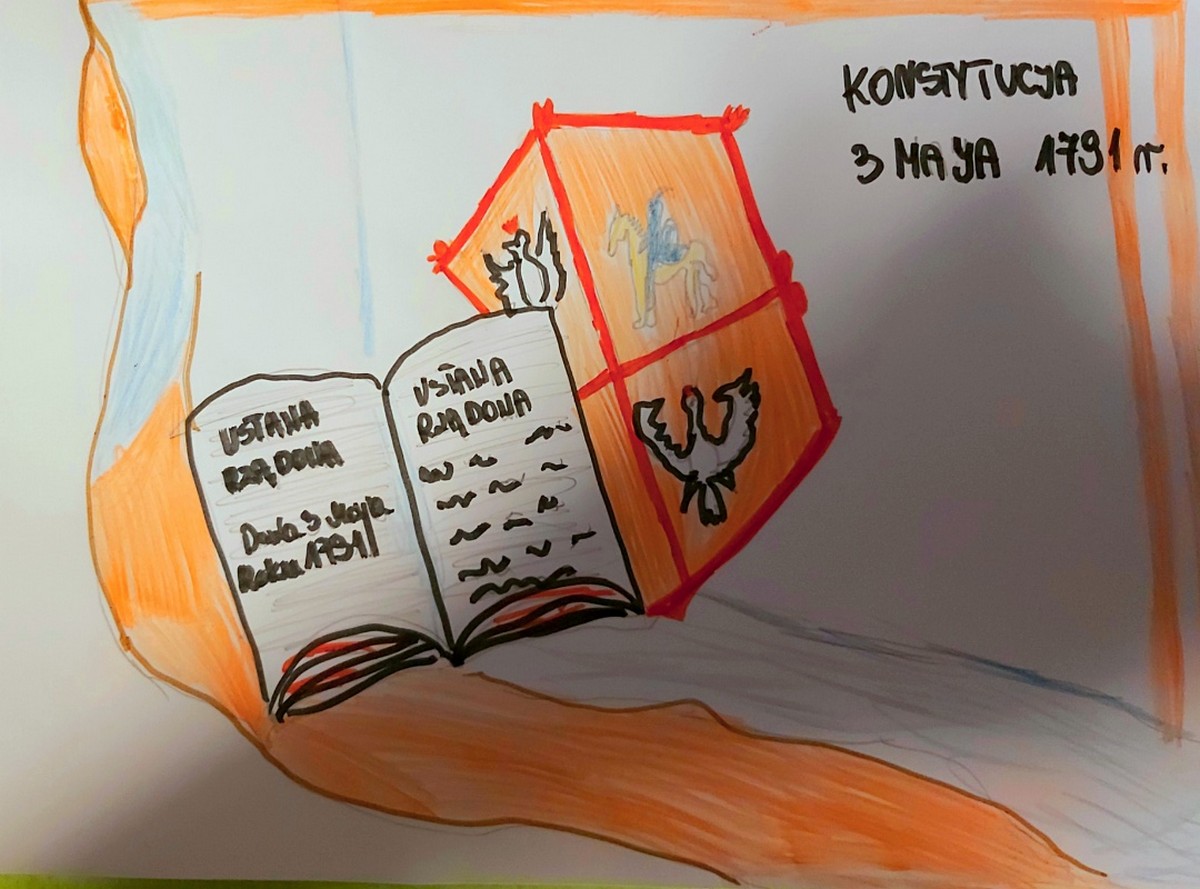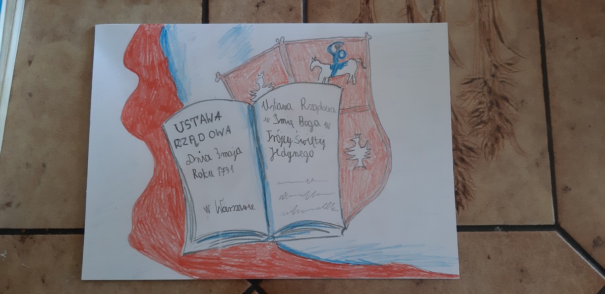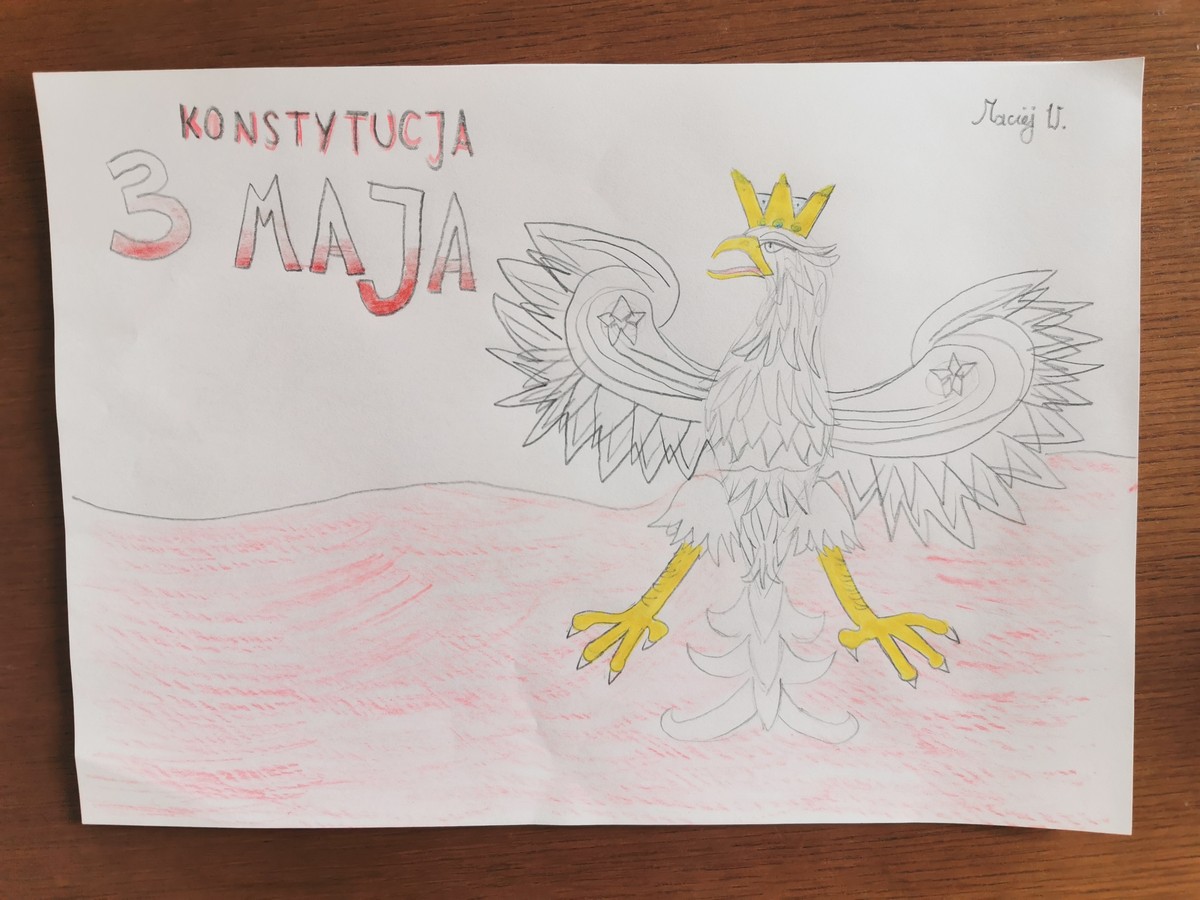 W tym roku uczniowie Szkoły Podstawowej nr 1 im. Henryka Sienkiewicza nie mogli obchodzić tego święta tak, jak to bywało w latach ubiegłych. Uroczyste apele, wystawy, wspólne śpiewanie pieśni patriotycznych nie były możliwe do zrealizowania. Ale to nie oznacza, że można było pominąć ten ważny w kalendarzu imprez szkolnych dzień. Uczniowie „Jedynki” z tej okazji przygotowali komiksy. Każdy zawierał ciekawostki na temat obchodzonego święta lub pomysły na świętowanie w dobie pandemii koronawirusa. Pomysłowość uczniów nie miała granic. Twórcy komiksów zaprezentowali m. in. pomysł zorganizowania wirtualnego koncertu, wirtualnego biegu z okazji Święta Konstytucji 3 Maja czy utworzenie zespołu muzycznego „Konstytucja”, którego członkowie to Konsty i Tucja. Młodsi uczniowie wzięli udział w wirtualnej lekcji historii na Zamku Królewskim w Warszawie, a następnie przystąpili do zilustrowania tego ważnego dla państwa polskiego wydarzenia, wyrażając uczucie radości i dumy, że są Polakami.