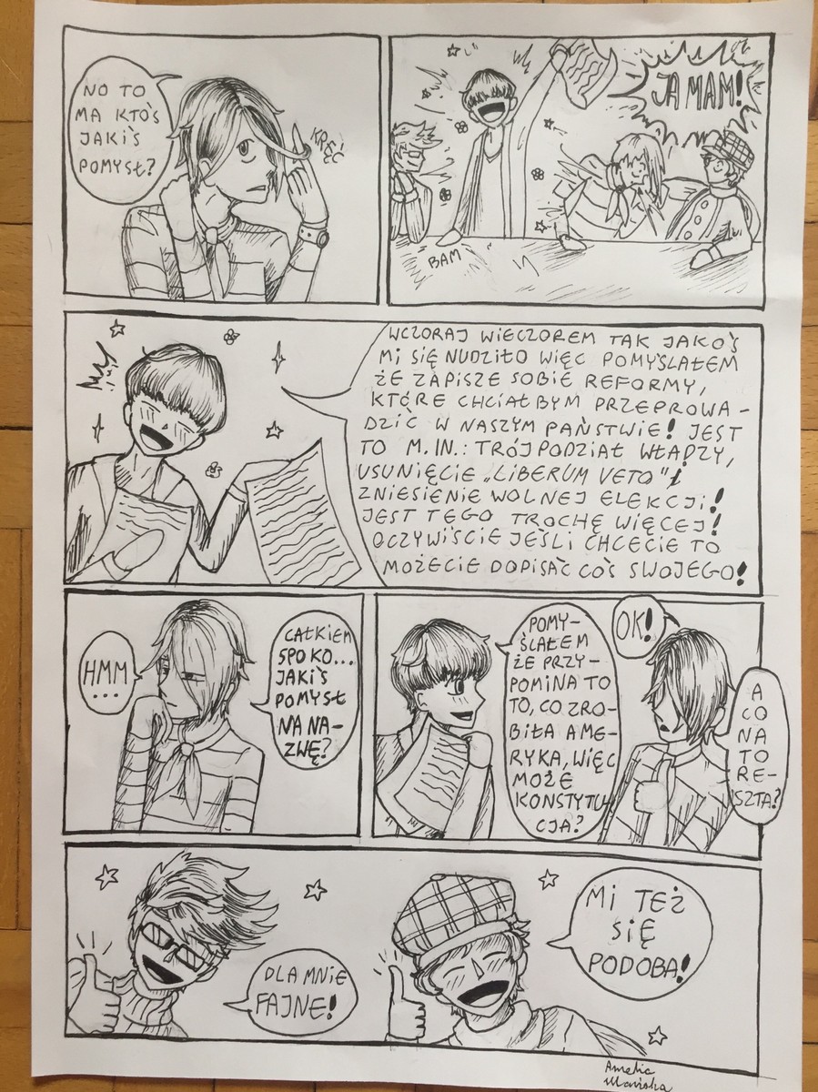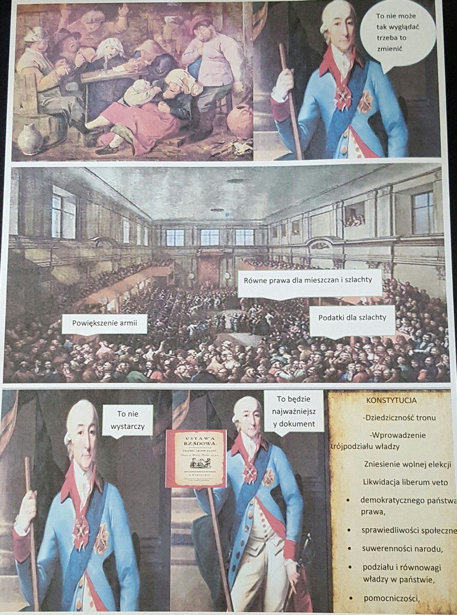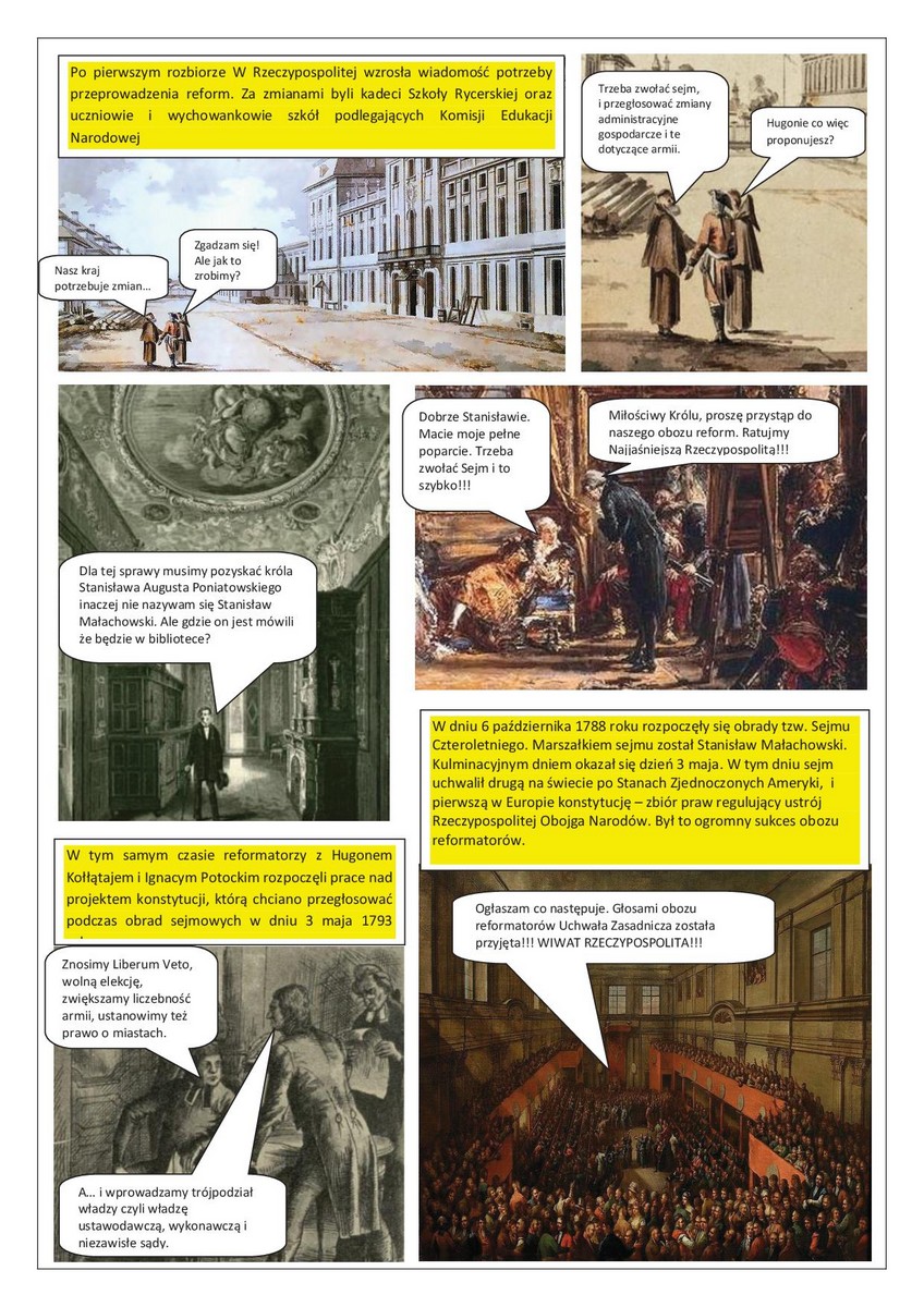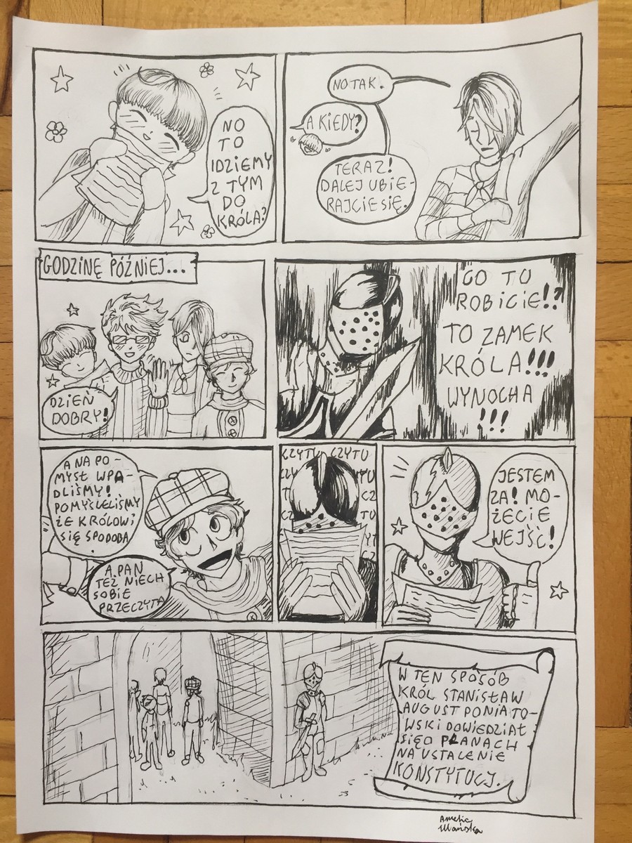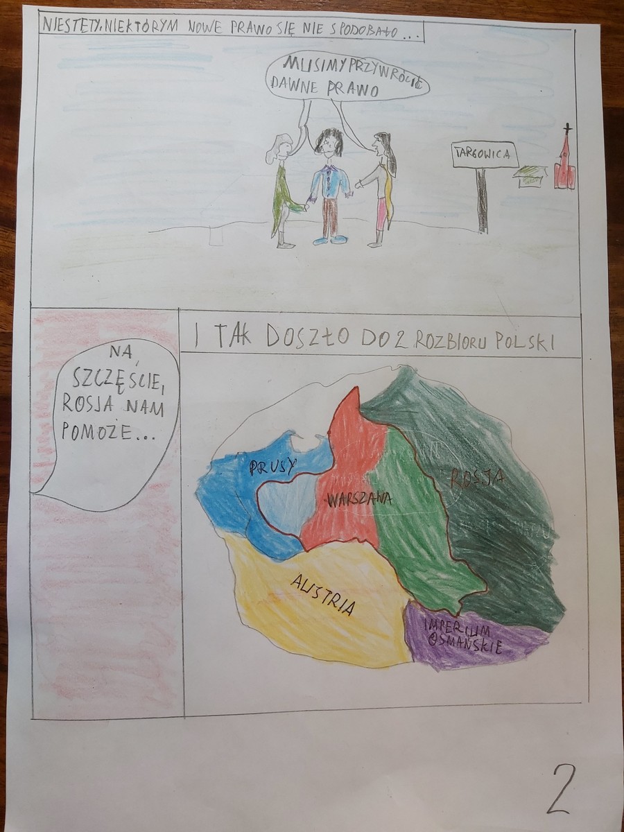 W tym roku uczniowie Szkoły Podstawowej nr 1 im. Henryka Sienkiewicza nie mogli obchodzić tego święta tak, jak to bywało w latach ubiegłych. Uroczyste apele, wystawy, wspólne śpiewanie pieśni patriotycznych nie były możliwe do zrealizowania. Ale to nie oznacza, że można było pominąć ten ważny w kalendarzu imprez szkolnych dzień. Uczniowie „Jedynki” z tej okazji przygotowali komiksy. Każdy zawierał ciekawostki na temat obchodzonego święta lub pomysły na świętowanie w dobie pandemii koronawirusa. Pomysłowość uczniów nie miała granic. Twórcy komiksów zaprezentowali m. in. pomysł zorganizowania wirtualnego koncertu, wirtualnego biegu z okazji Święta Konstytucji 3 Maja czy utworzenie zespołu muzycznego „Konstytucja”, którego członkowie to Konsty i Tucja. Młodsi uczniowie wzięli udział w wirtualnej lekcji historii na Zamku Królewskim w Warszawie, a następnie przystąpili do zilustrowania tego ważnego dla państwa polskiego wydarzenia, wyrażając uczucie radości i dumy, że są Polakami.