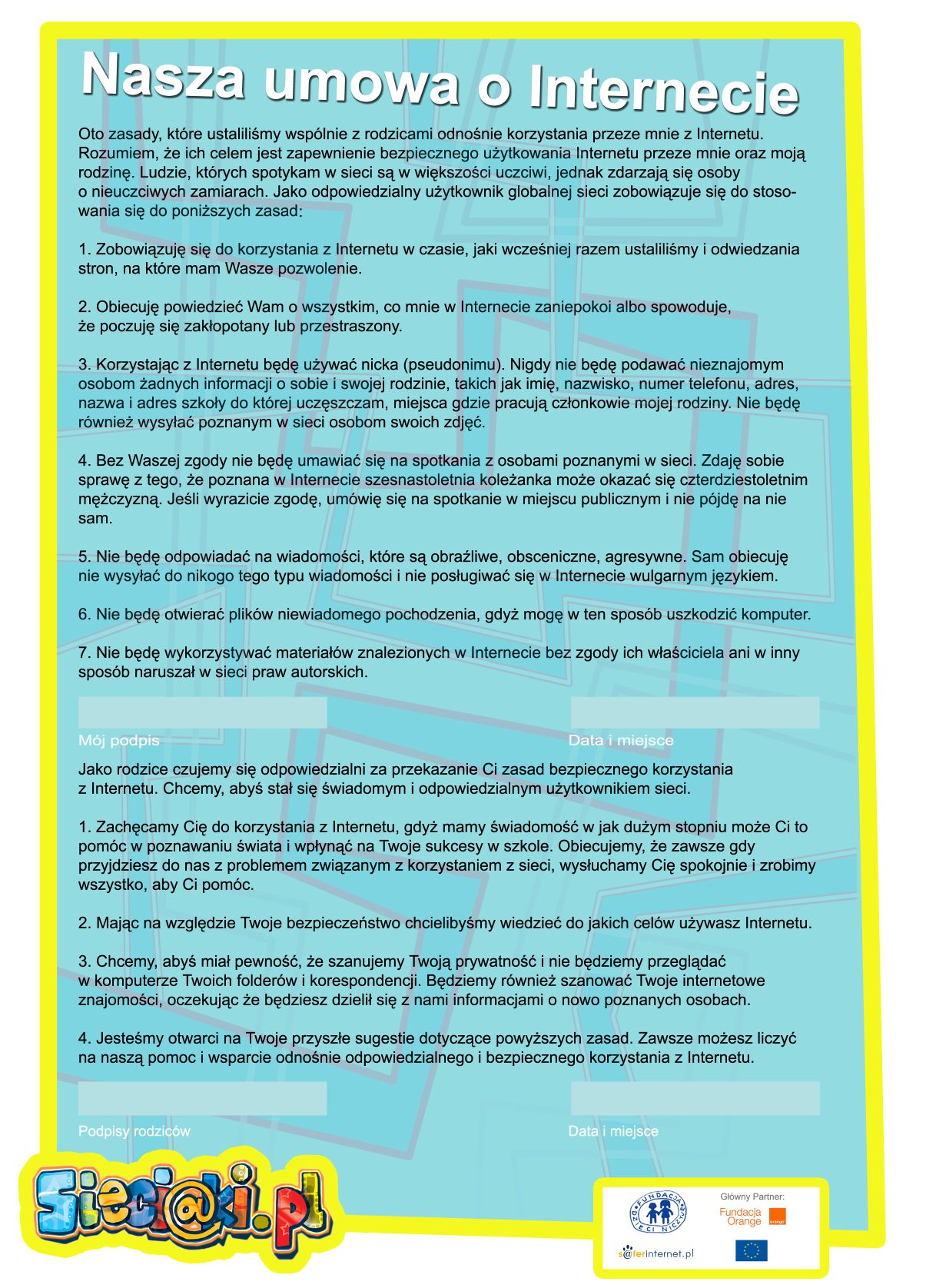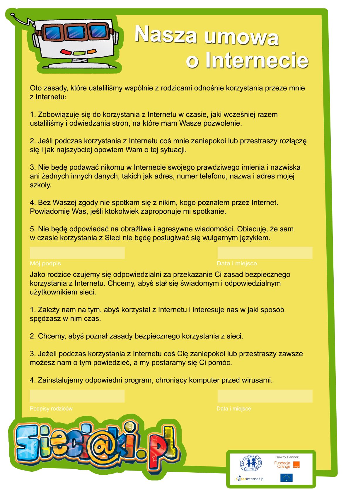 Internet jest wspaniałym wynalazkiem oraz narzędziem komunikacji i edukacji. Trudno nam sobie wyobrazić obecnie życie bez dostępu do sieci. Jednakże należy pamiętać, że nawet najwspanialsze możliwości komputera i Internetu nie mogą przysłonić nam świadomości, że świat wirtualny niesie ze sobą wiele niebezpieczeństw. W celu stworzenia dzieciom bezpiecznych warunków do korzystania z sieci proponujemy, aby rodzice i dzieci zawarli ?Umowę o Internecie? Podpisując ją wszyscy zgadzają się na warunki jakie stawia kontrakt. Gotowe teksty umów (do wydrukowania) znajdą Państwo poniżej:
