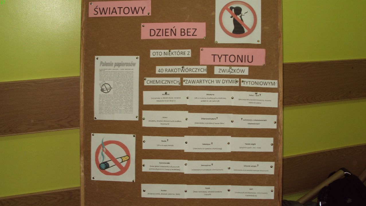 Dnia 15 listopada 2012r. w Szkole Podstawowej nr 1 w Turku odbyły się działania nawiązujące do Światowego Dnia Rzucania Palenia Tytoniu. W tym dniu cała szkoła uczestniczyła w projekcie „Drzewo Życia”. Każda klasa na listkach wpisywała hasła związane ze zdrowym stylem życia, które później doczepiane były do „Drzewa Życia”. Innymi atrakcjami były również konkursy: na najciekawszy plakat o szkodliwości palenia (klasy II i III), „List do rodziców” (klasy I), Ulotki „Palenie szkodzi” (klasy V i VI). Wszystkie prace oraz ulotki zostały przedstawione na spotkaniu z rodzicami. Podczas spotkań z rodzicami odbyły się również pogadanki na temat szkodliwości palenia tytoniu. Na korytarzach widać było nie tylko plakaty, gazetki szkolne, ale również prezentacje multimedialne związane ze skutkami palenia papierosów.