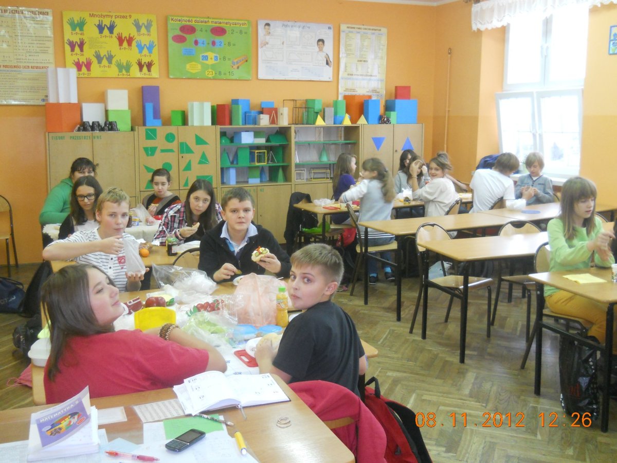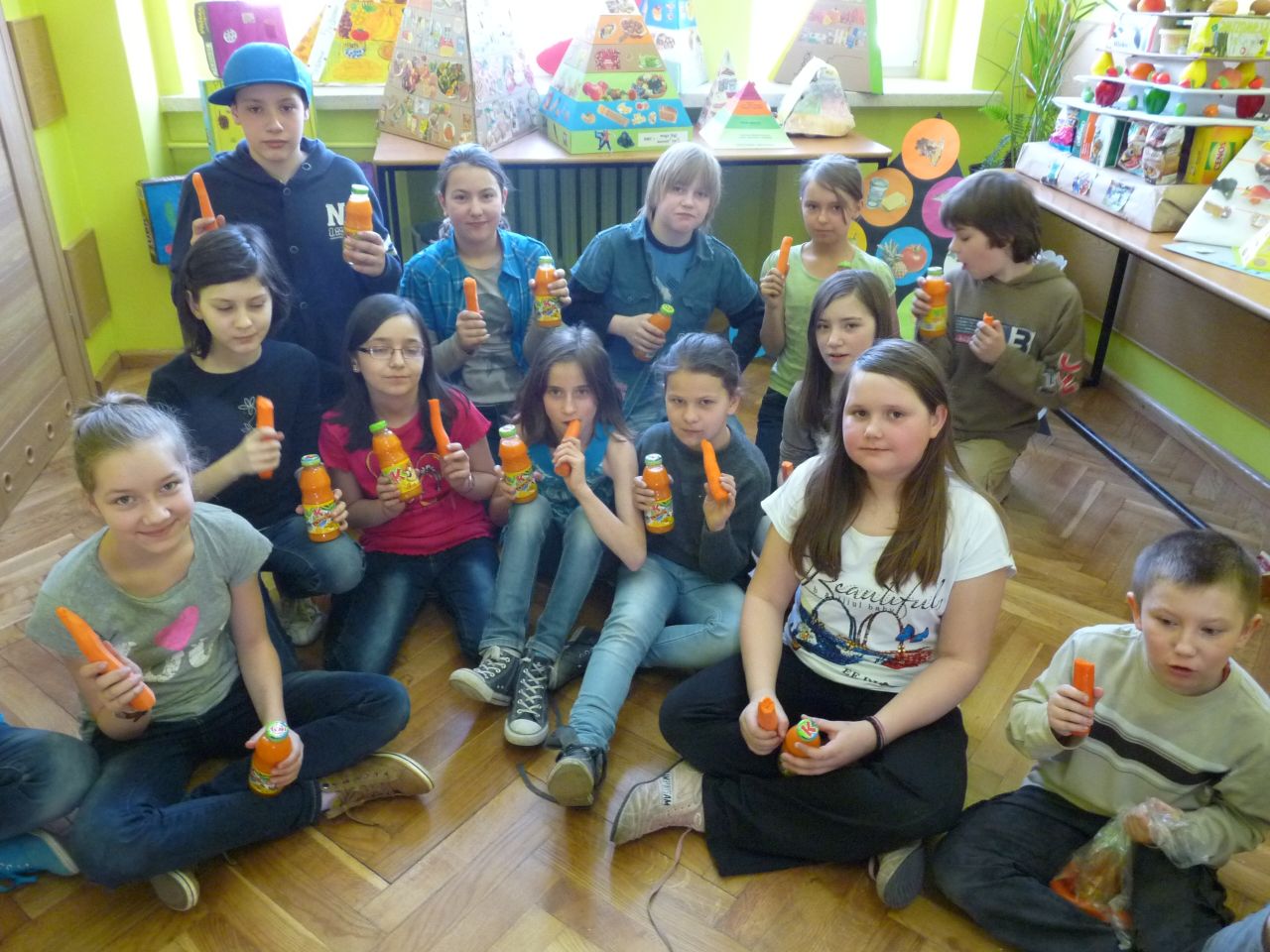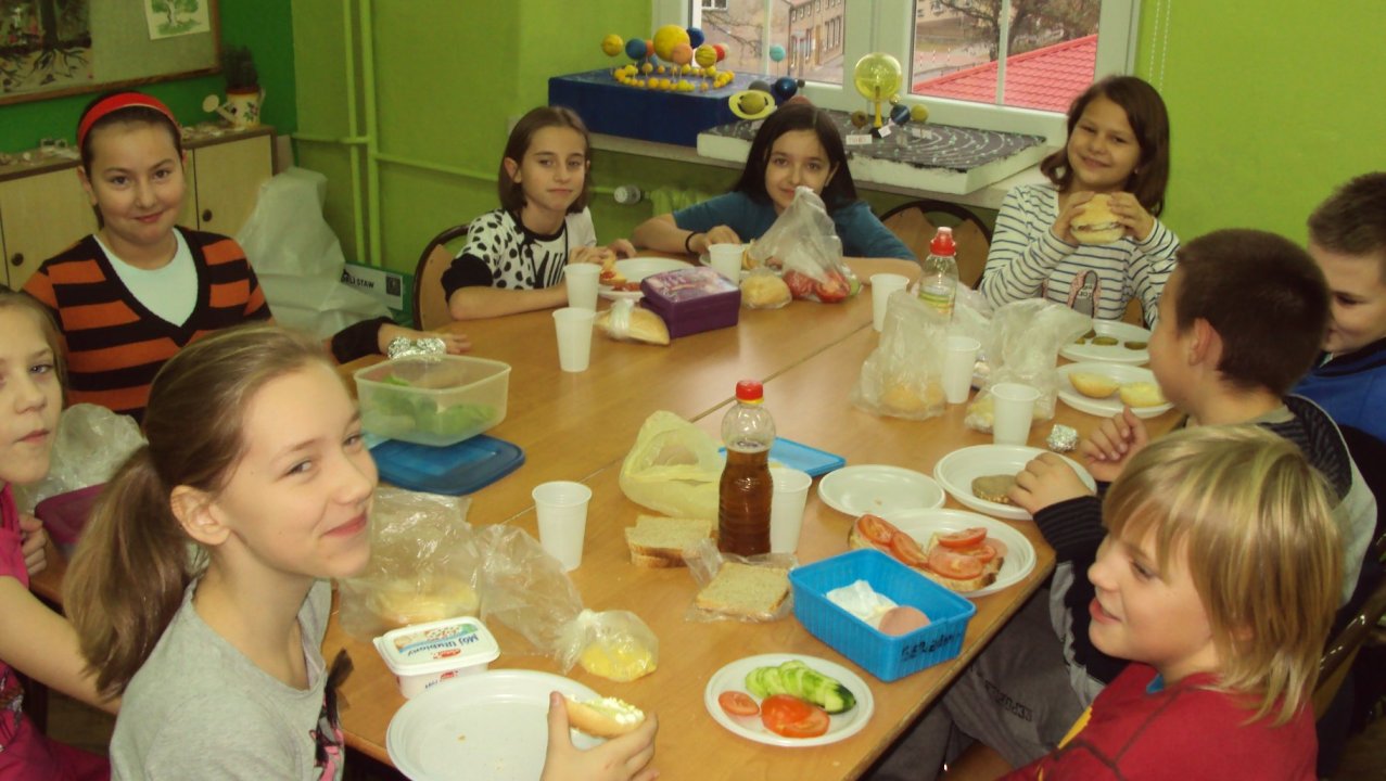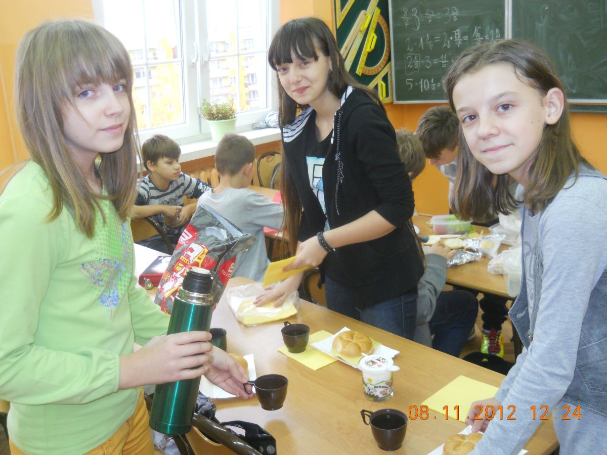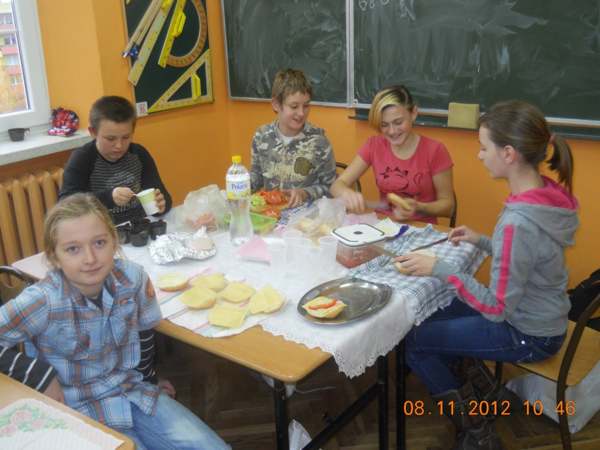 W związku z tym 8 listopada każda klasa w Jedynce wg własnego pomysłu organizowała zdrowe śniadanie. Była to świetna zabawa o dużych walorach edukacyjnych. Dzieci z apetytem jadły ciemne pieczywo z gzikiem lub domowymi konfiturami. Dużym powodzeniem ciszyły się sałatki owocowe i warzywne, kolorowe kanapki a do picia kompoty i domowej roboty soki. W tym dniu zamiast chipsów dzieci chrupały marchew, zamiast słodkich groszków wyciągały rękę po winogrono.