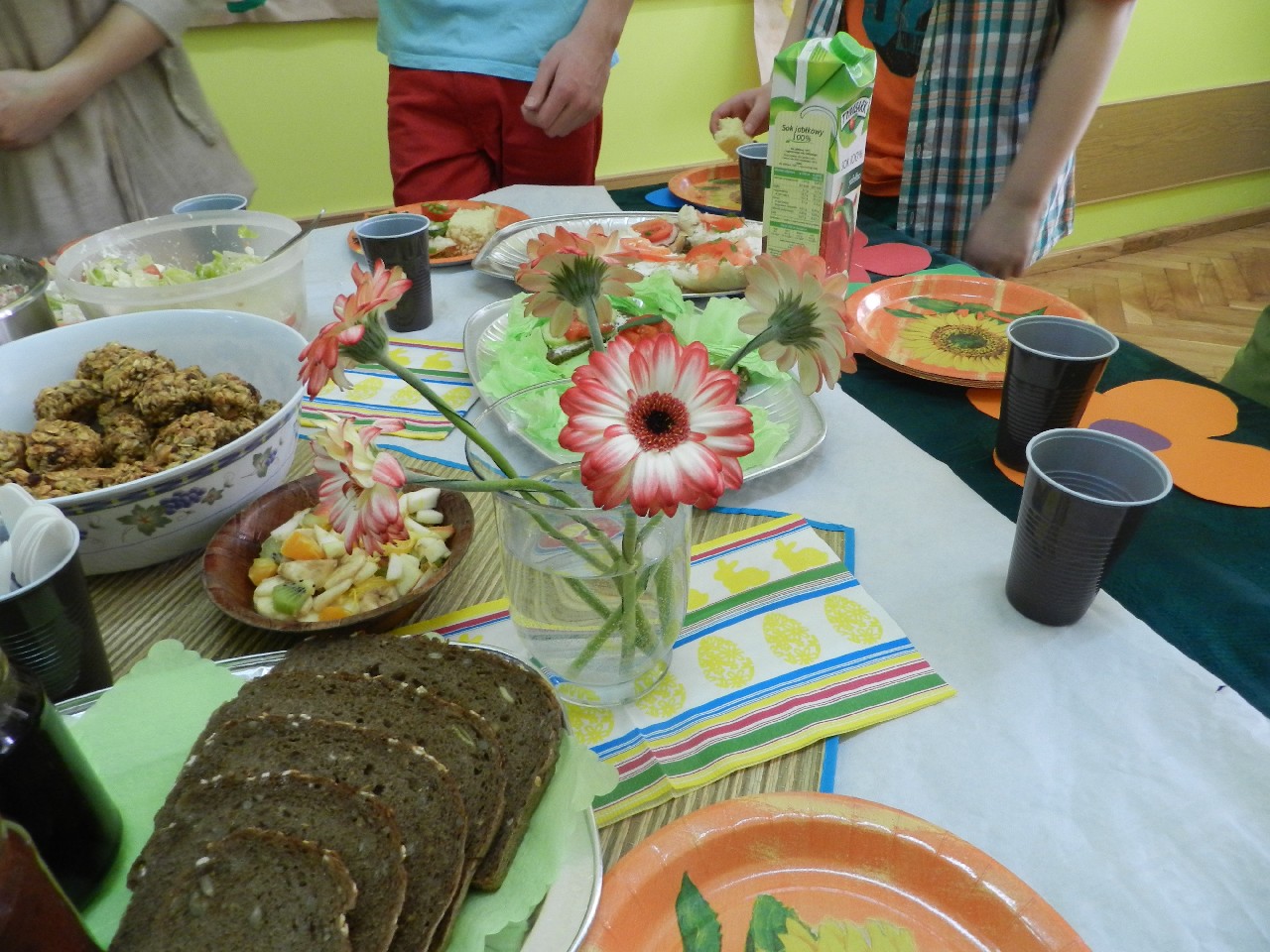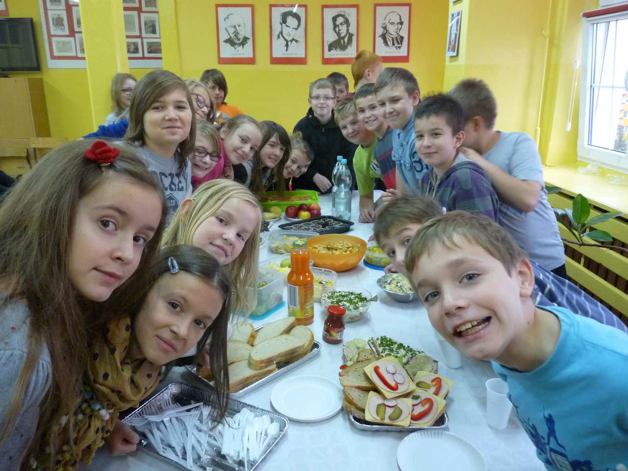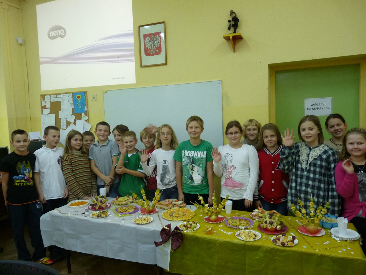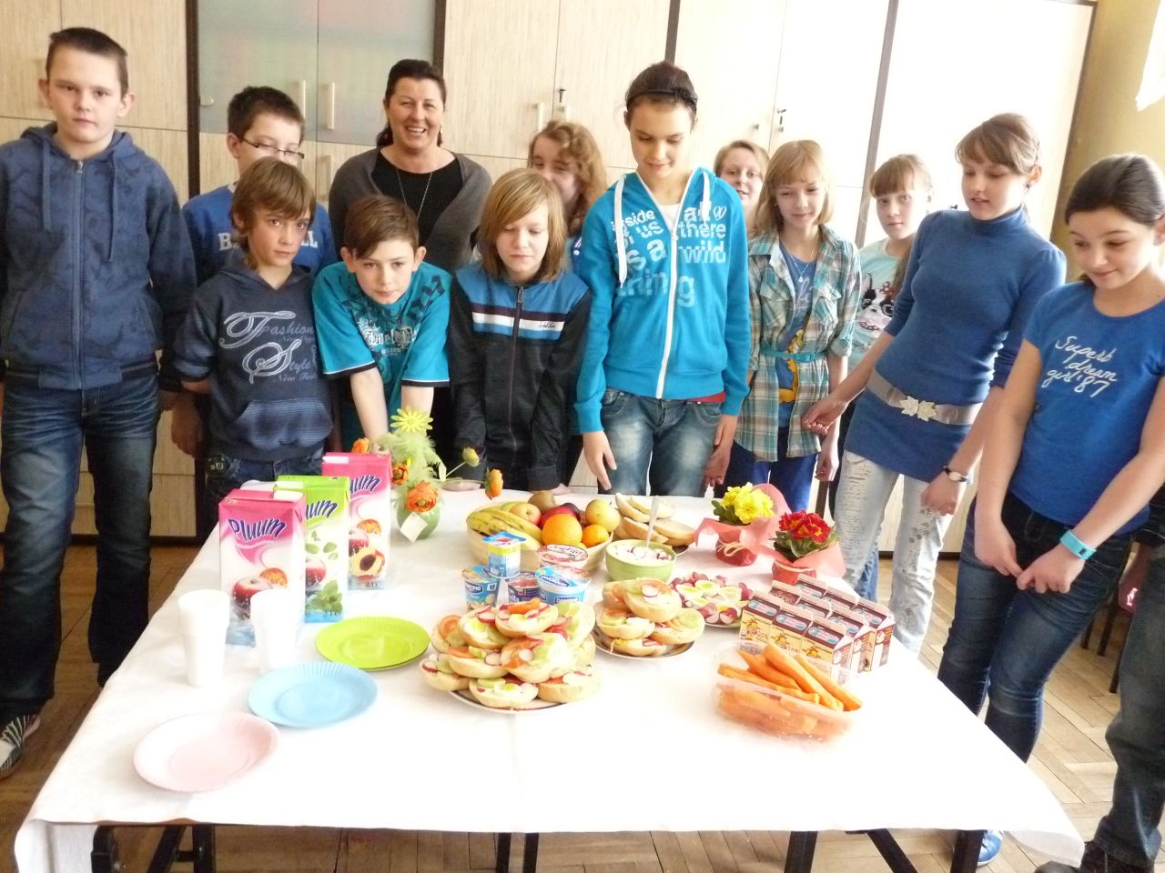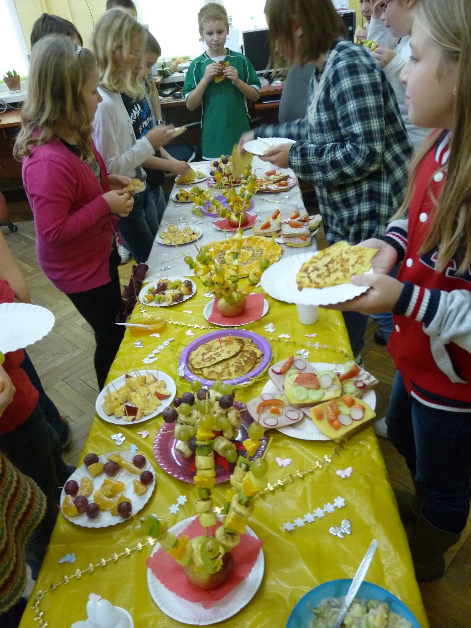 W związku z tym 8 listopada każda klasa w Jedynce wg własnego pomysłu organizowała zdrowe śniadanie. Była to świetna zabawa o dużych walorach edukacyjnych. Dzieci z apetytem jadły ciemne pieczywo z gzikiem lub domowymi konfiturami. Dużym powodzeniem ciszyły się sałatki owocowe i warzywne, kolorowe kanapki a do picia kompoty i domowej roboty soki. W tym dniu zamiast chipsów dzieci chrupały marchew, zamiast słodkich groszków wyciągały rękę po winogrono.