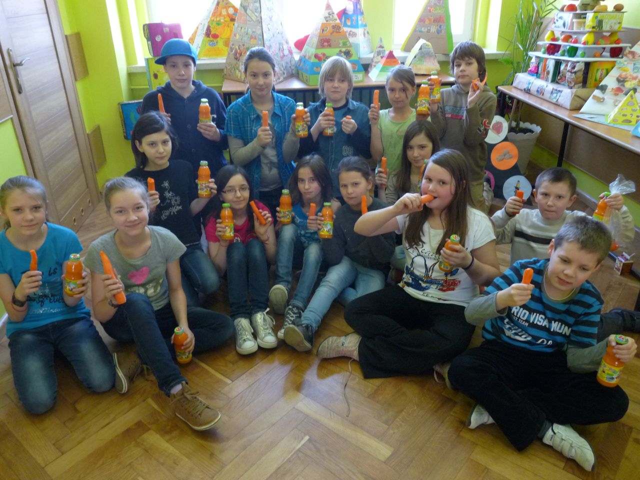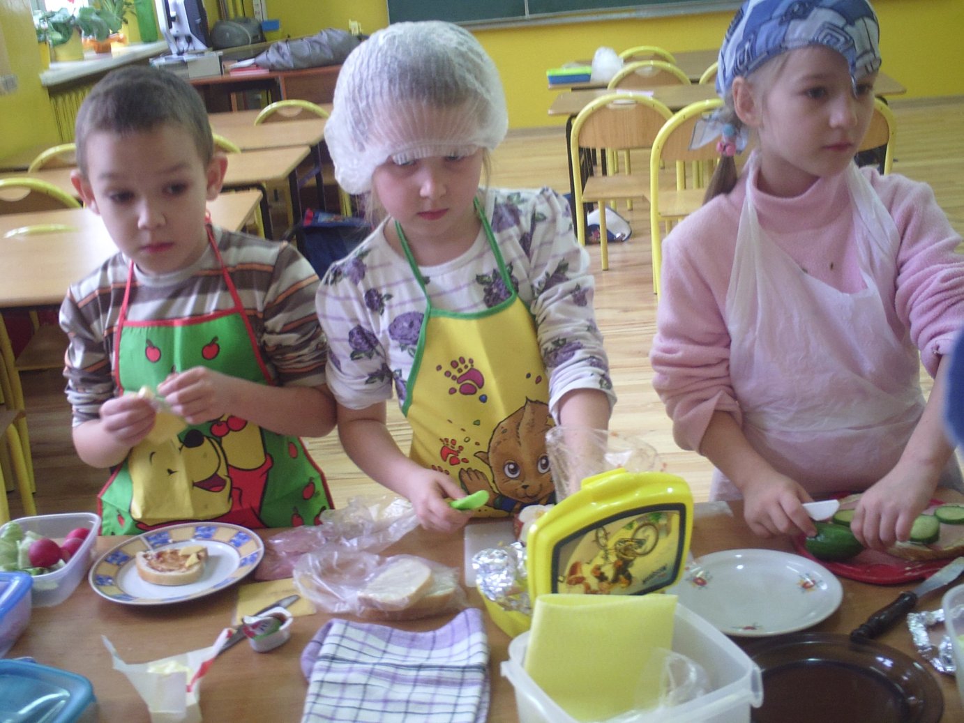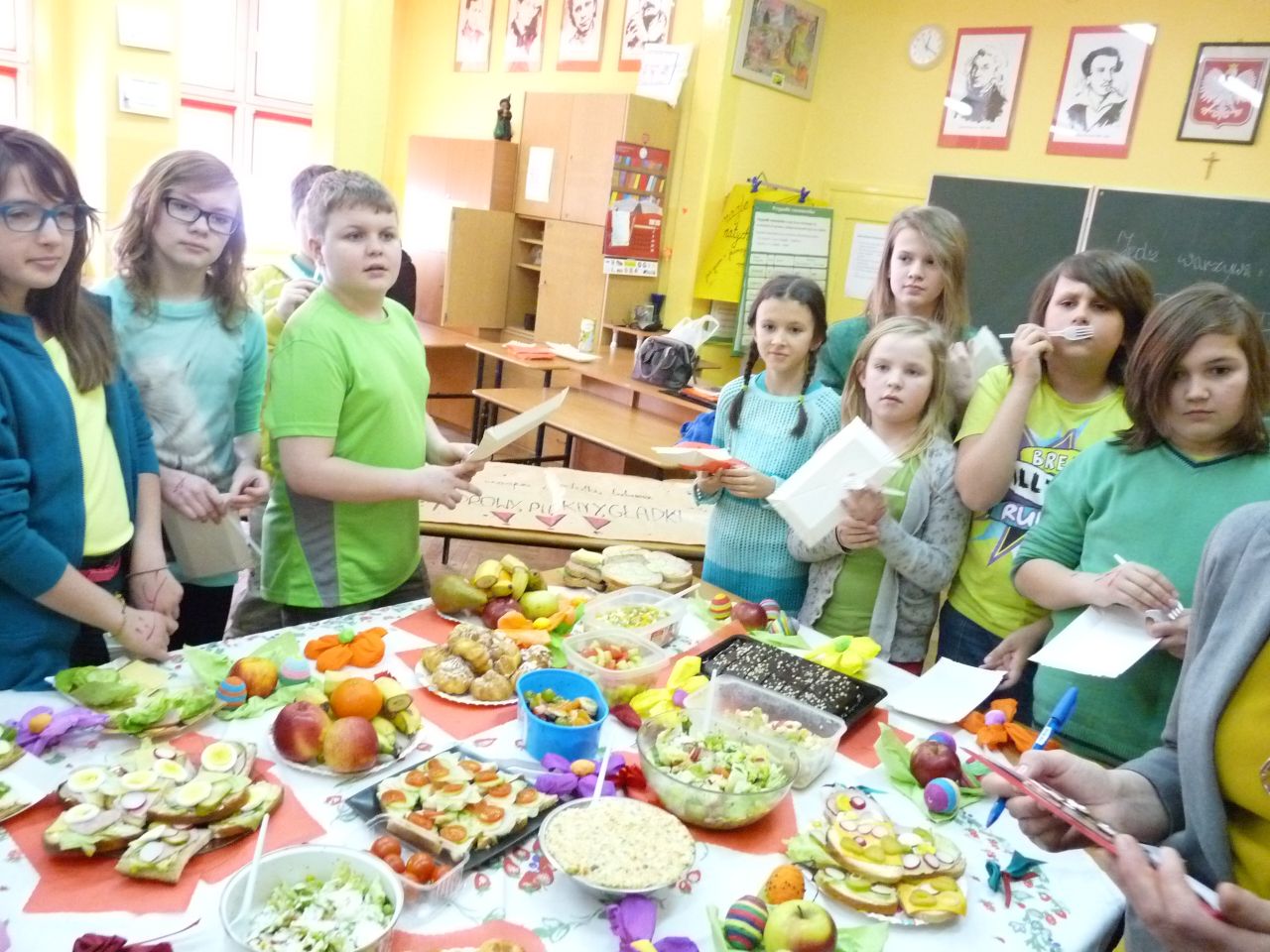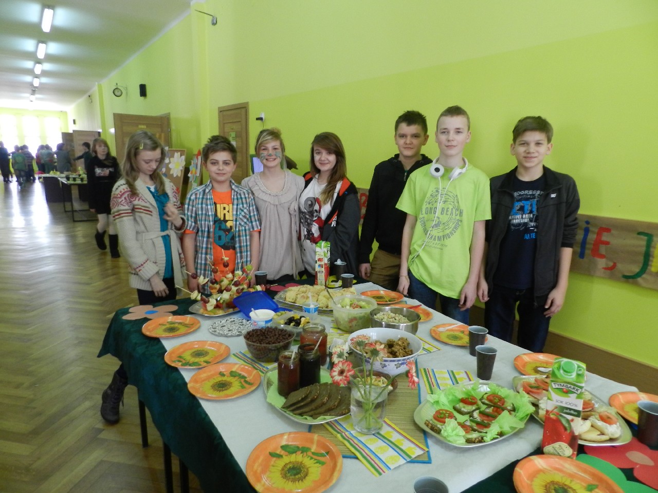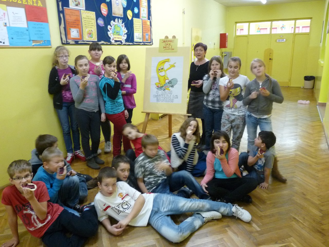 W związku z tym 8 listopada każda klasa w Jedynce wg własnego pomysłu organizowała zdrowe śniadanie. Była to świetna zabawa o dużych walorach edukacyjnych. Dzieci z apetytem jadły ciemne pieczywo z gzikiem lub domowymi konfiturami. Dużym powodzeniem ciszyły się sałatki owocowe i warzywne, kolorowe kanapki a do picia kompoty i domowej roboty soki. W tym dniu zamiast chipsów dzieci chrupały marchew, zamiast słodkich groszków wyciągały rękę po winogrono.