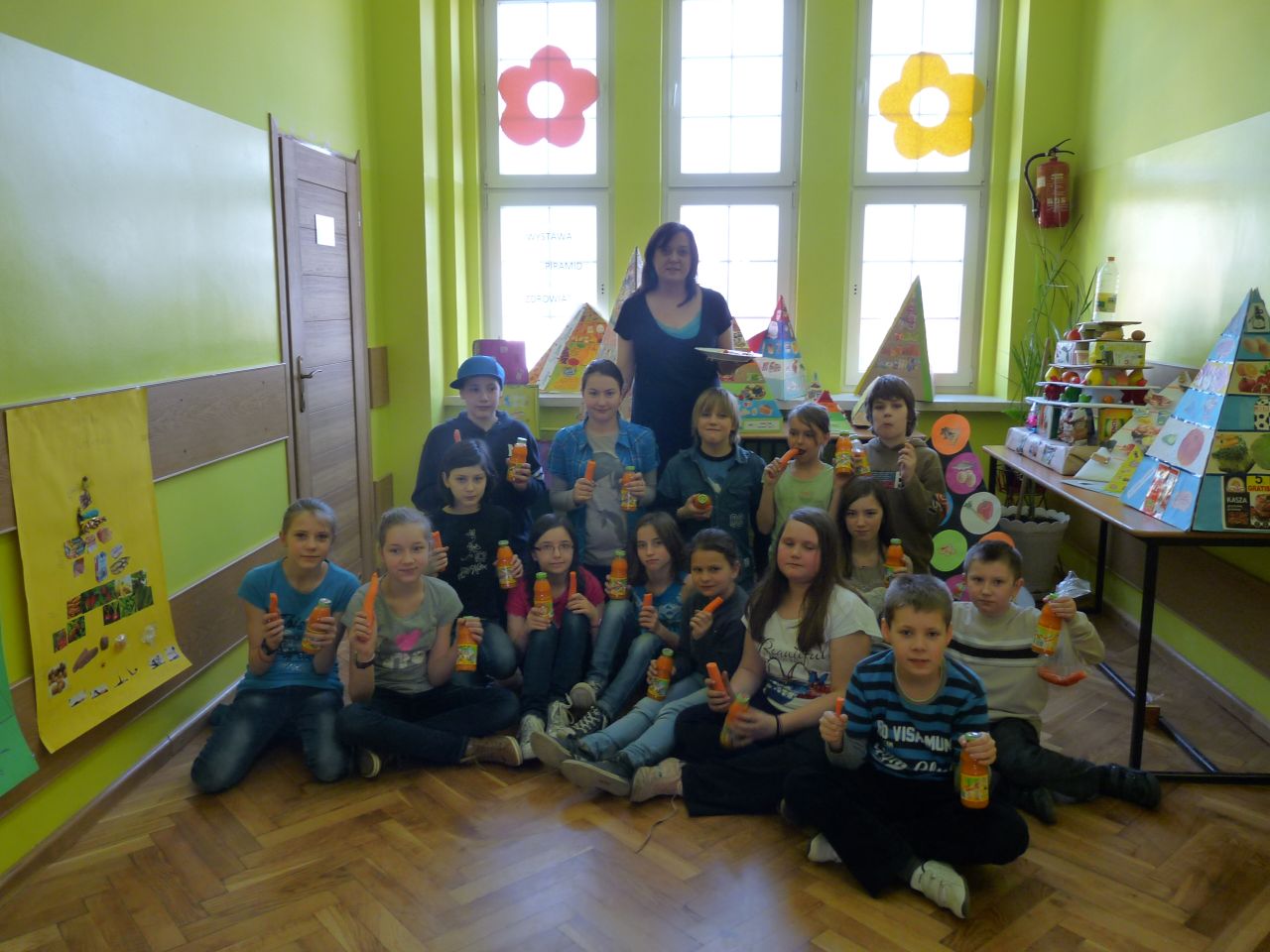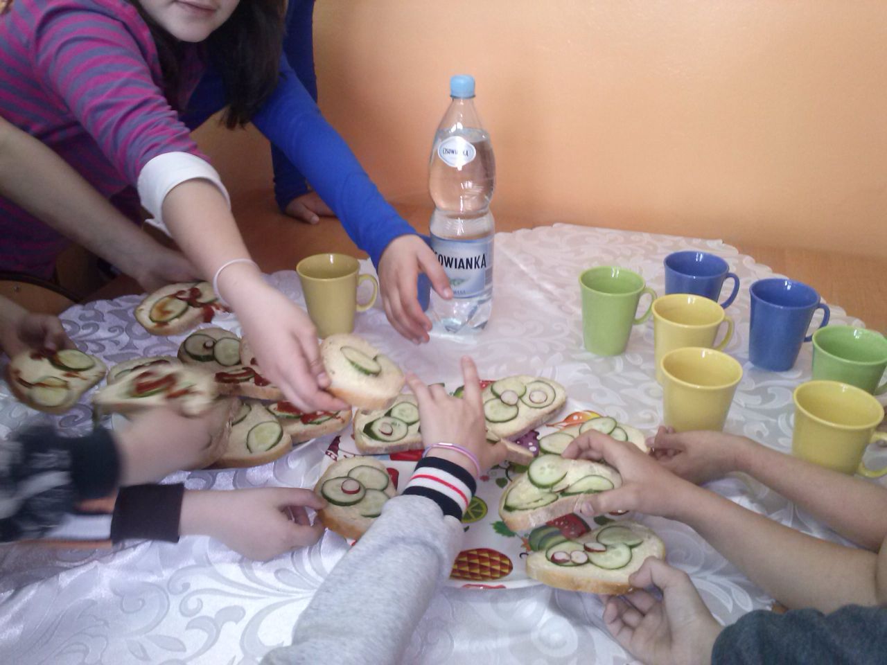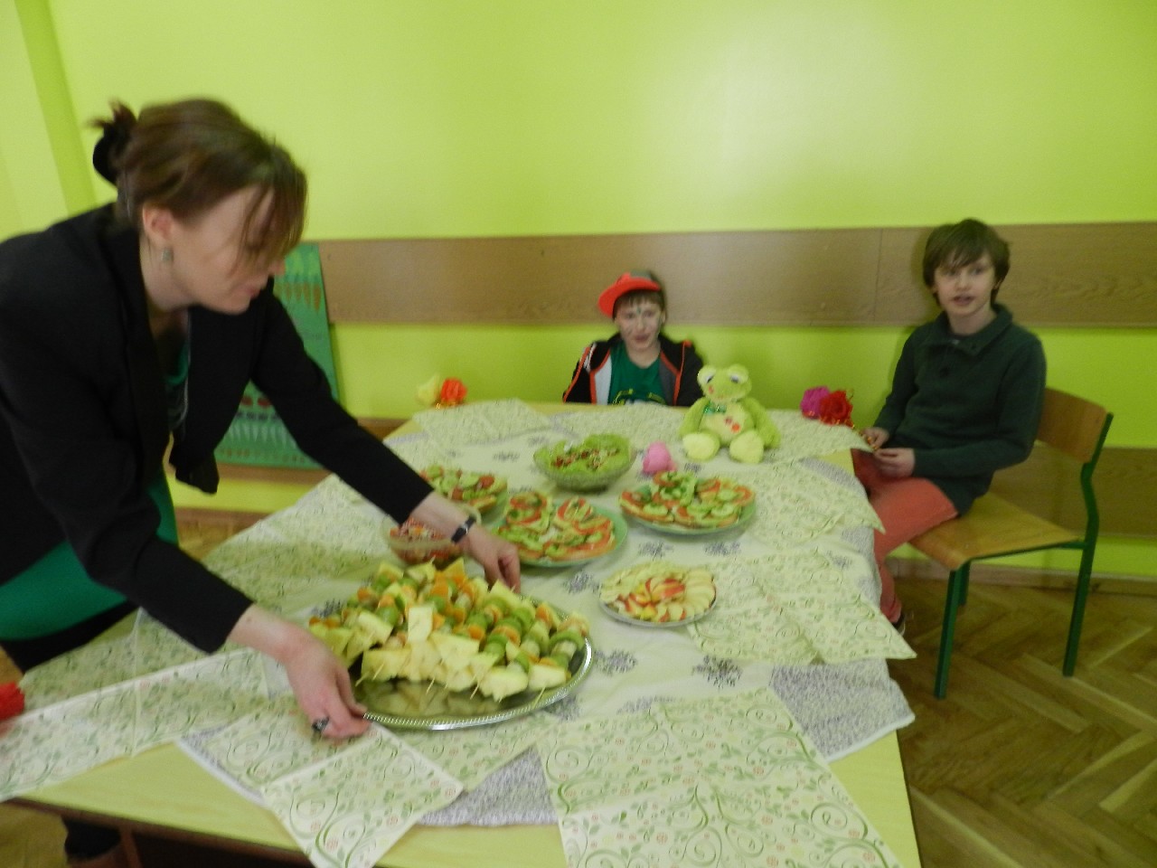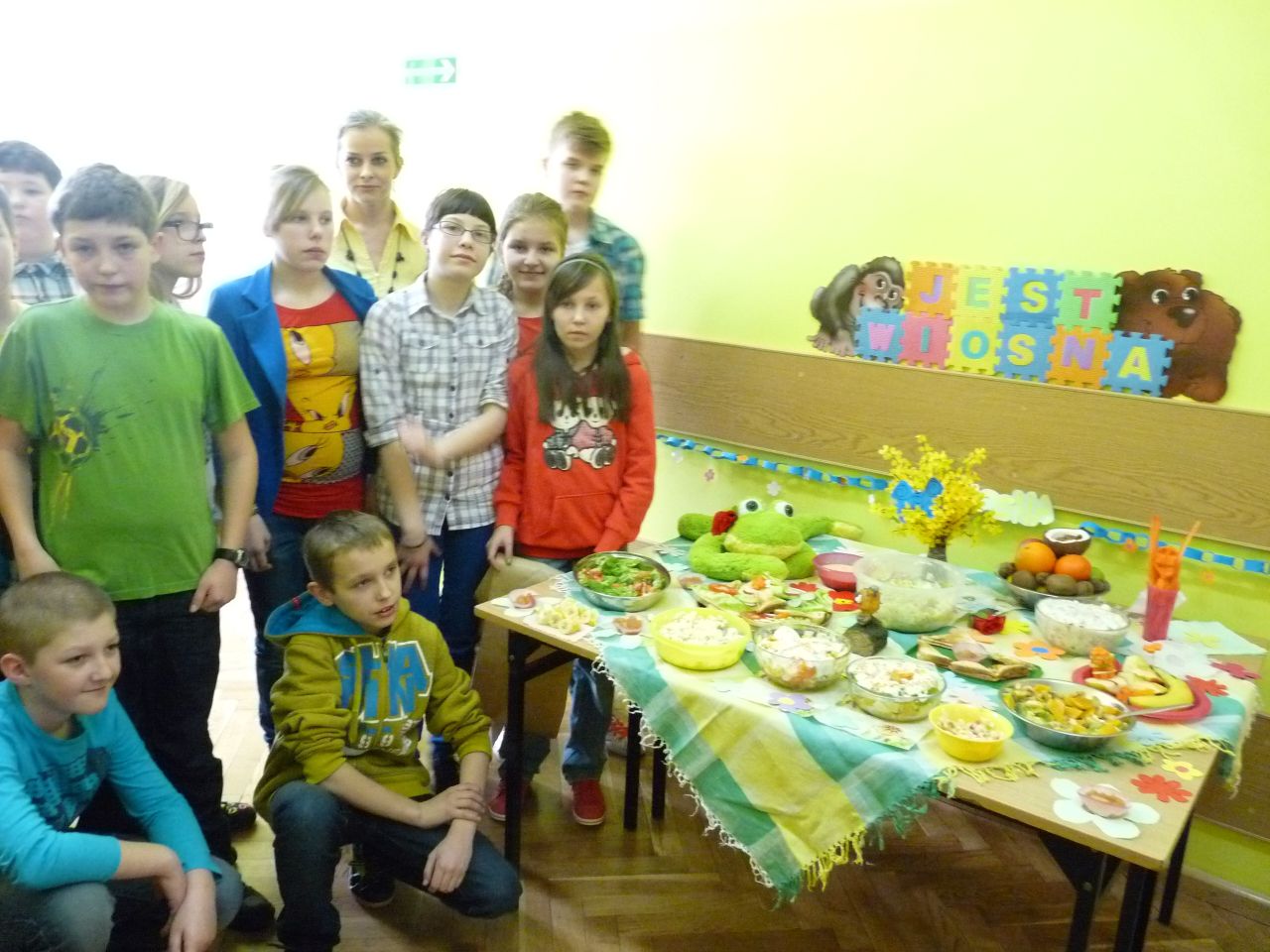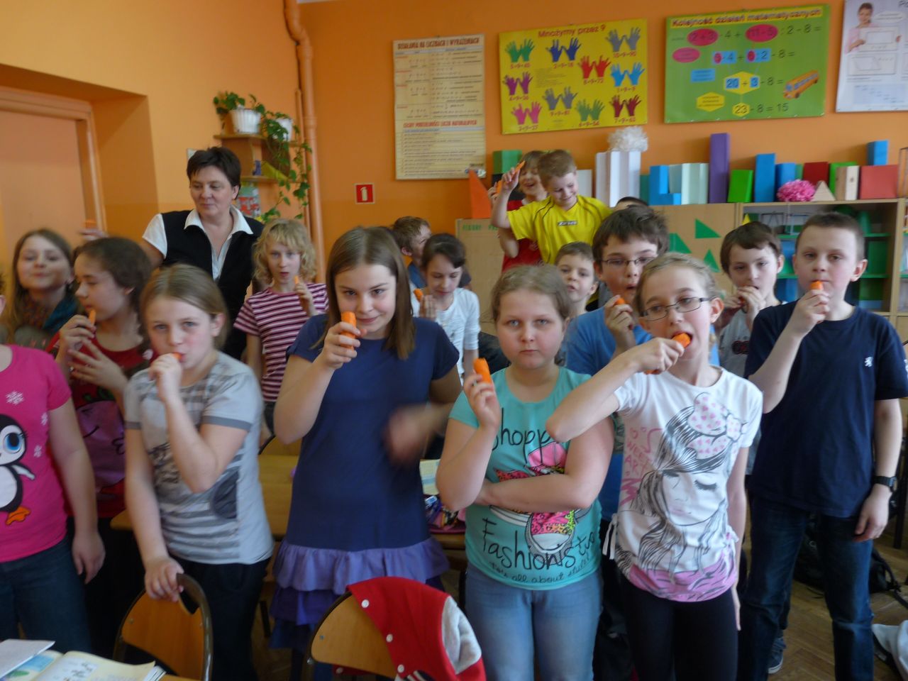 W związku z tym 8 listopada każda klasa w Jedynce wg własnego pomysłu organizowała zdrowe śniadanie. Była to świetna zabawa o dużych walorach edukacyjnych. Dzieci z apetytem jadły ciemne pieczywo z gzikiem lub domowymi konfiturami. Dużym powodzeniem ciszyły się sałatki owocowe i warzywne, kolorowe kanapki a do picia kompoty i domowej roboty soki. W tym dniu zamiast chipsów dzieci chrupały marchew, zamiast słodkich groszków wyciągały rękę po winogrono.