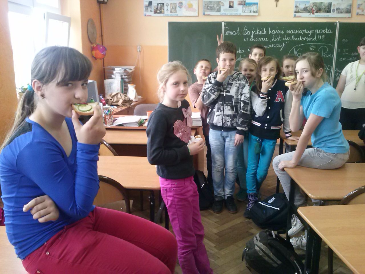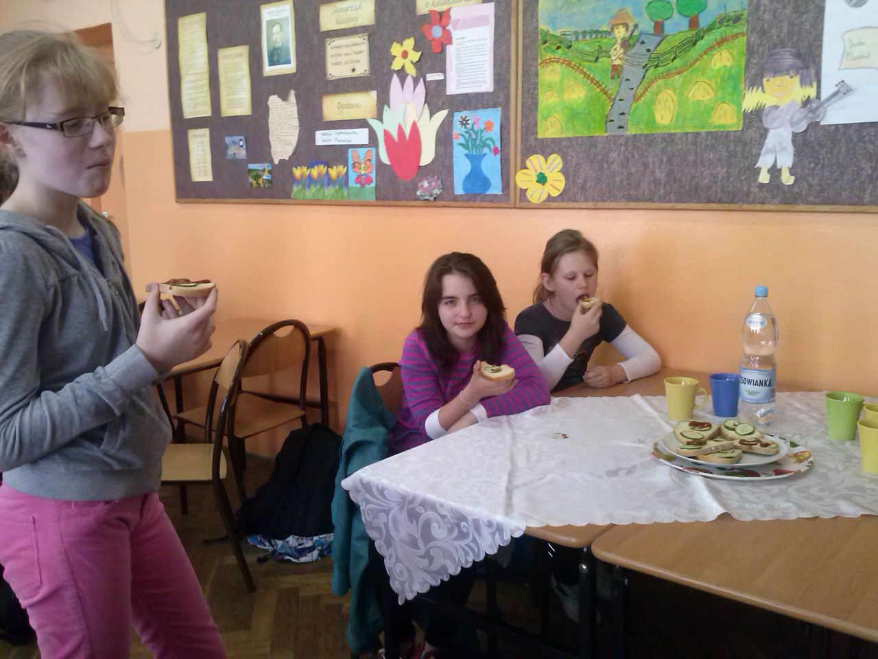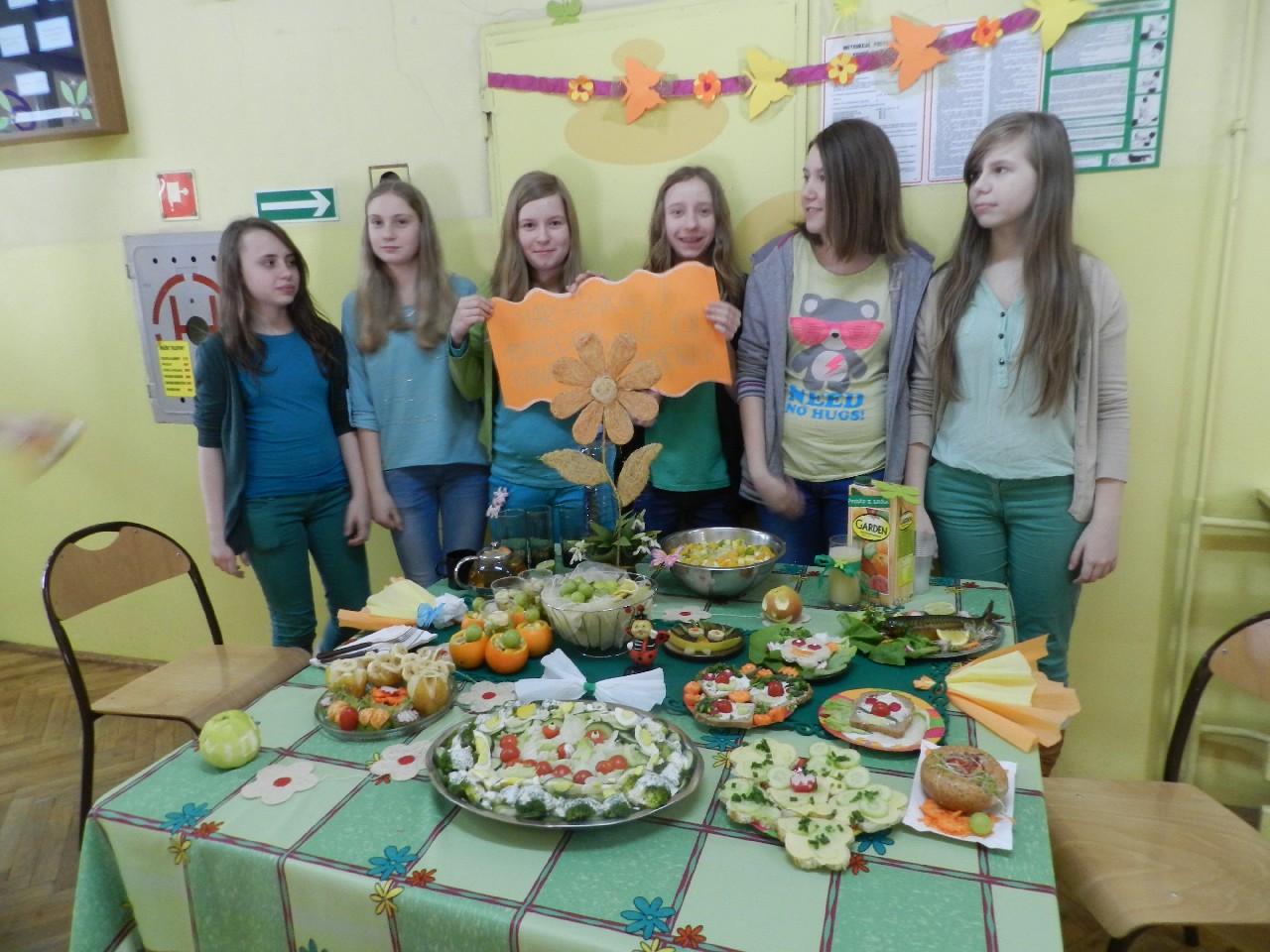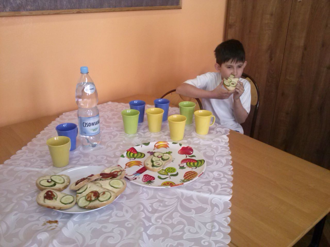W związku z tym 8 listopada każda klasa w Jedynce wg własnego pomysłu organizowała zdrowe śniadanie. Była to świetna zabawa o dużych walorach edukacyjnych. Dzieci z apetytem jadły ciemne pieczywo z gzikiem lub domowymi konfiturami. Dużym powodzeniem ciszyły się sałatki owocowe i warzywne, kolorowe kanapki a do picia kompoty i domowej roboty soki. W tym dniu zamiast chipsów dzieci chrupały marchew, zamiast słodkich groszków wyciągały rękę po winogrono.