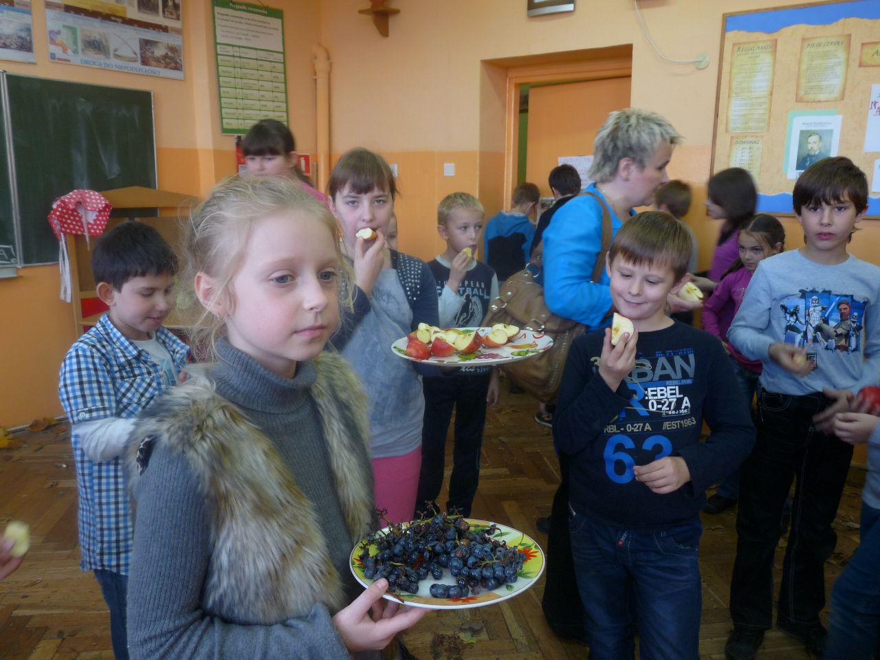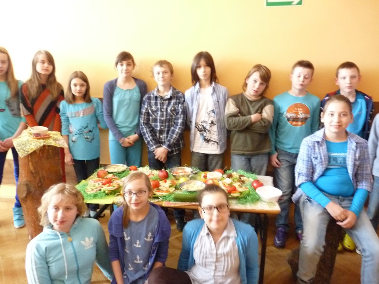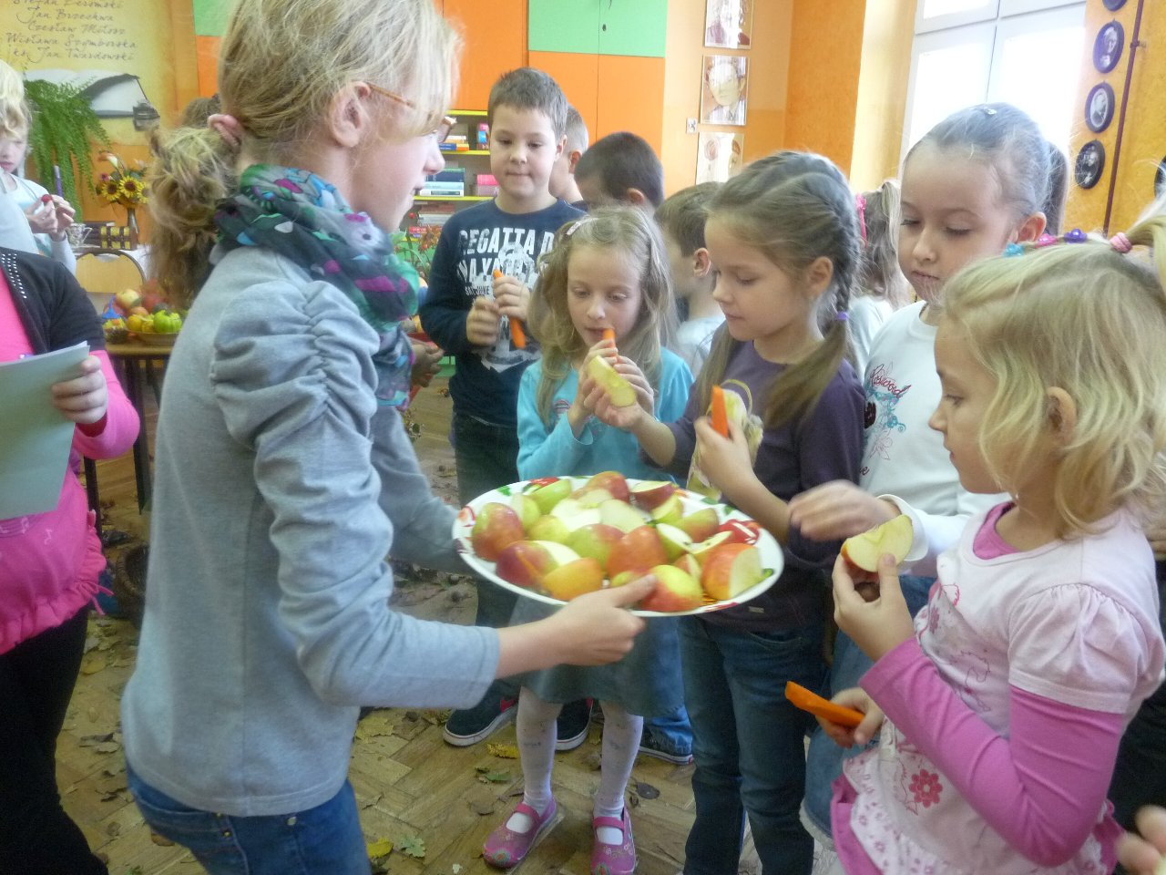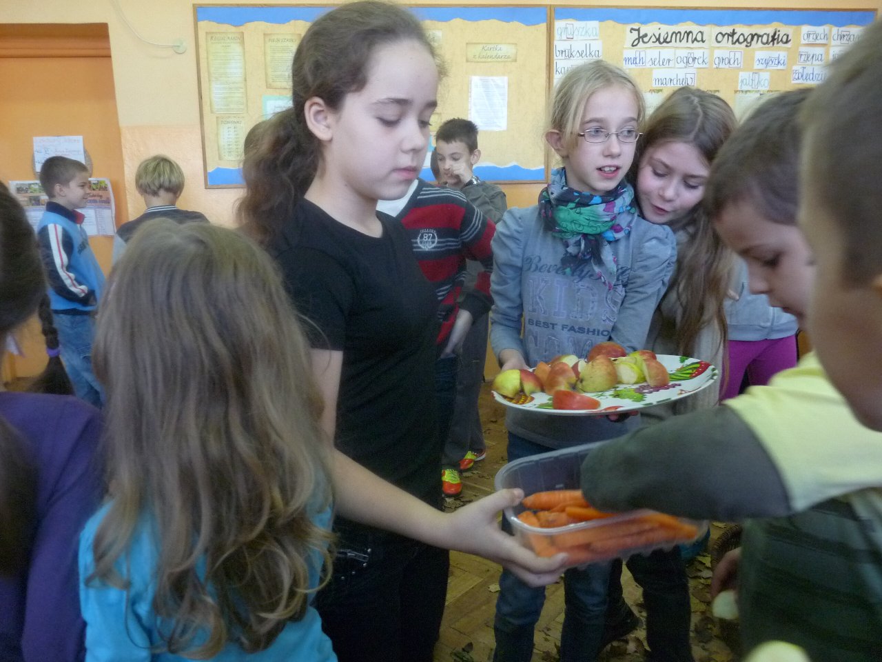 Lekcja języka polskiego była ciekawa również z tego względu, że uczestniczyli w niej uczniowie klas I, II i IV. Uczniowie świetnie ze sobą współpracowali.. Zadania były tak opracowane, że brali w nich udział zarówno starsi jak i młodsi. Zadań do wykonania było wiele, angażowały do pracy wszystkich uczniów. Dzieci wykazały się dużą wiedzą na temat wartości odżywczych warzyw i owoców. Niektóre dzieci próbowały dane warzywo lub owoc ze stwierdzeniem, że jedzą coś po raz pierwszy. Lekcja języka polskiego stworzyła okazję do tego aby przekonać uczniów , że jesień ma w sobie całe bogactwo zapachów, kolorów, kształtów a także wartości odżywczych, które są w warzywach i owocach.