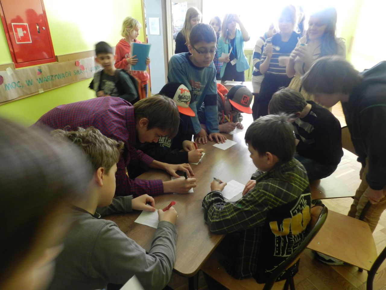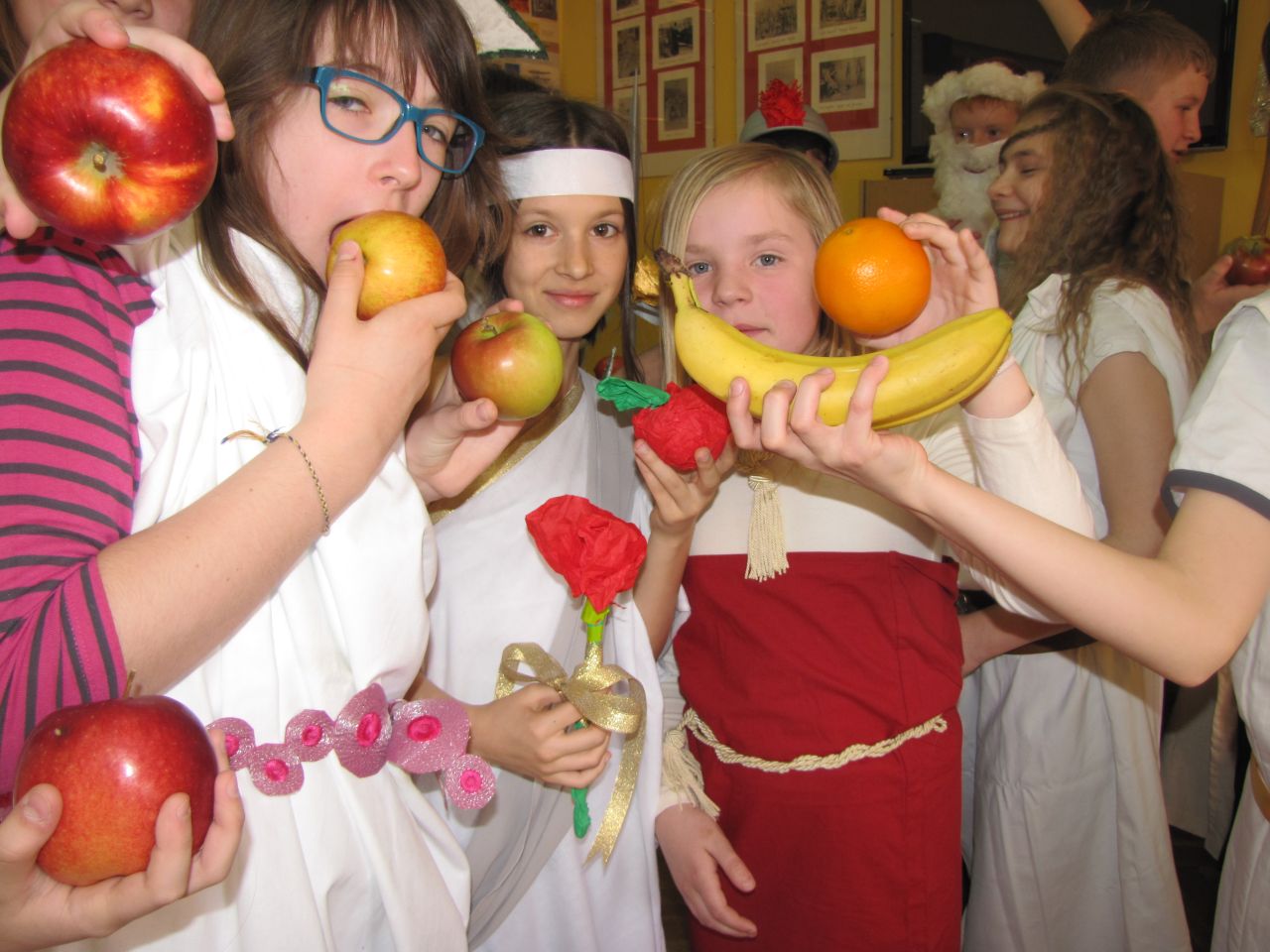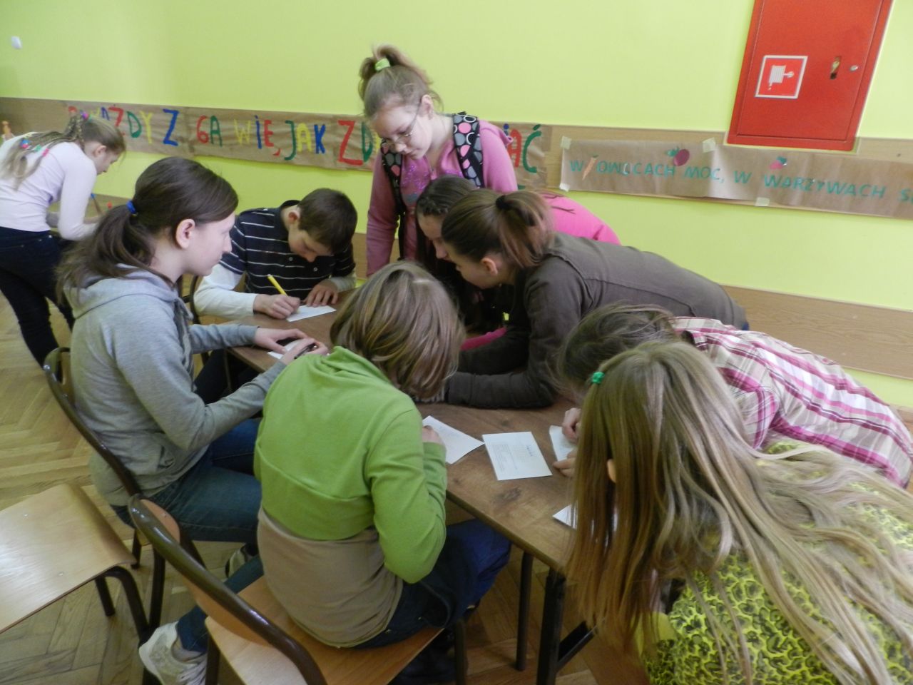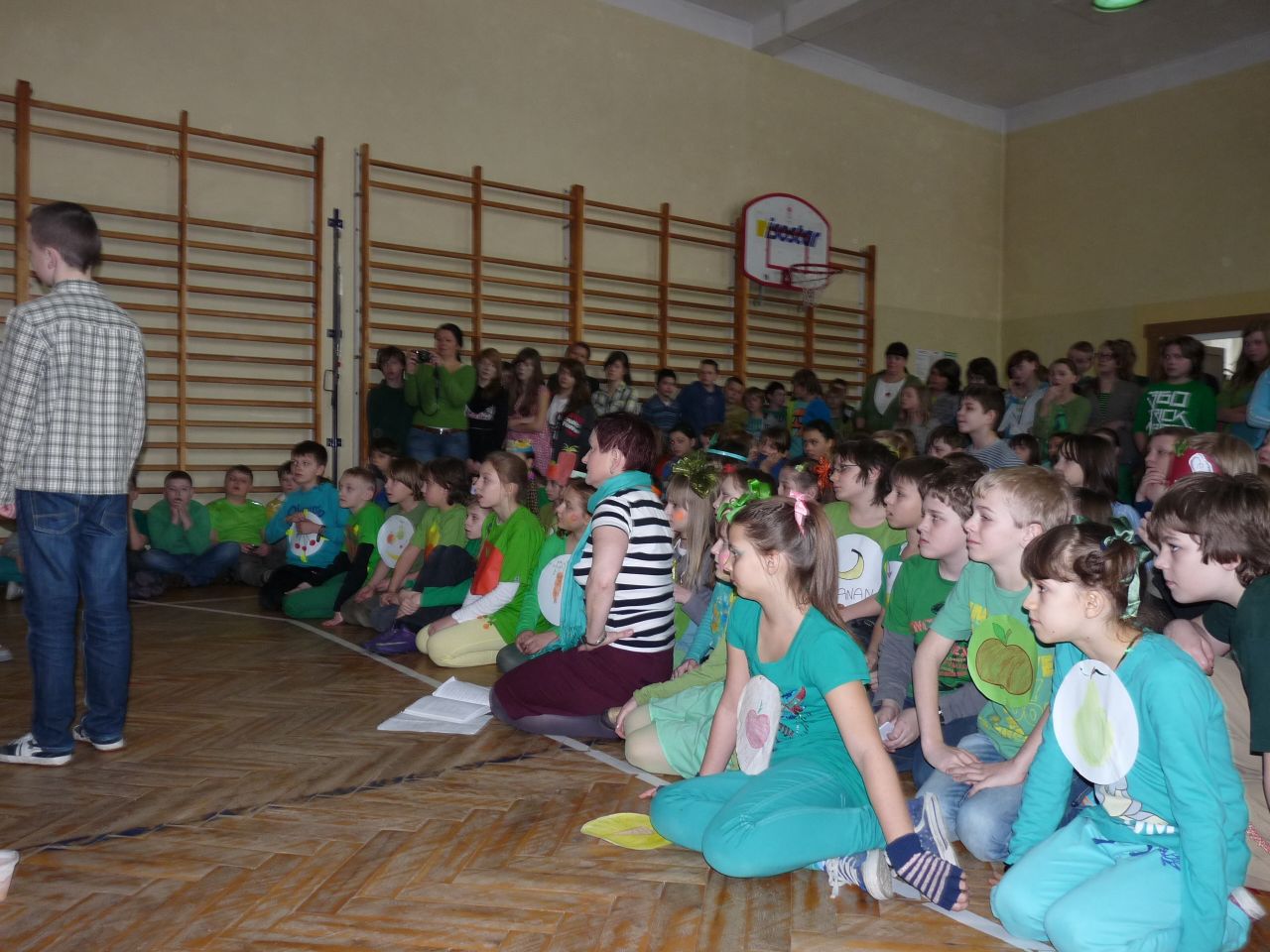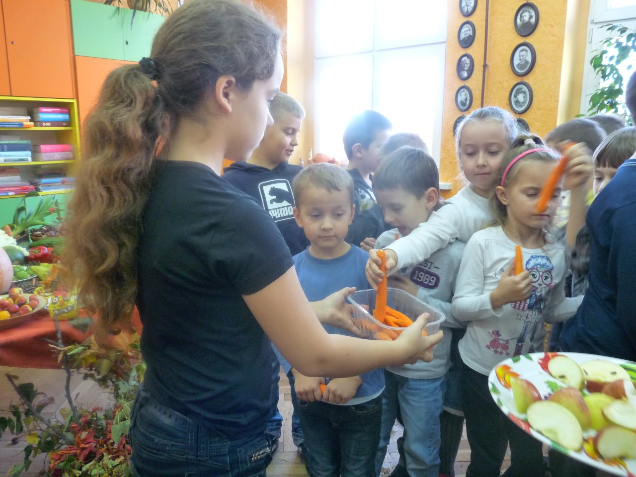 Lekcja języka polskiego była ciekawa również z tego względu, że uczestniczyli w niej uczniowie klas I, II i IV. Uczniowie świetnie ze sobą współpracowali.. Zadania były tak opracowane, że brali w nich udział zarówno starsi jak i młodsi. Zadań do wykonania było wiele, angażowały do pracy wszystkich uczniów. Dzieci wykazały się dużą wiedzą na temat wartości odżywczych warzyw i owoców. Niektóre dzieci próbowały dane warzywo lub owoc ze stwierdzeniem, że jedzą coś po raz pierwszy. Lekcja języka polskiego stworzyła okazję do tego aby przekonać uczniów , że jesień ma w sobie całe bogactwo zapachów, kolorów, kształtów a także wartości odżywczych, które są w warzywach i owocach.